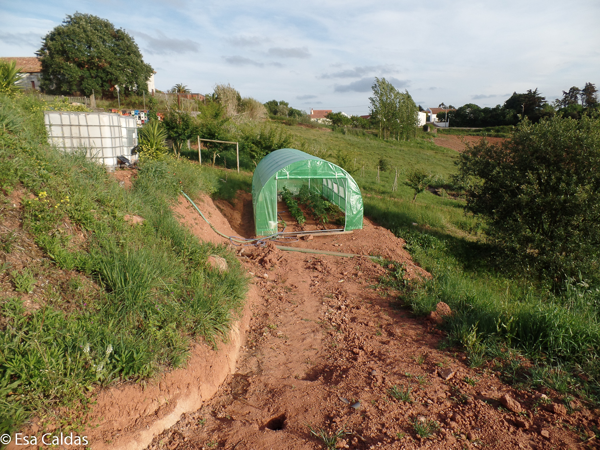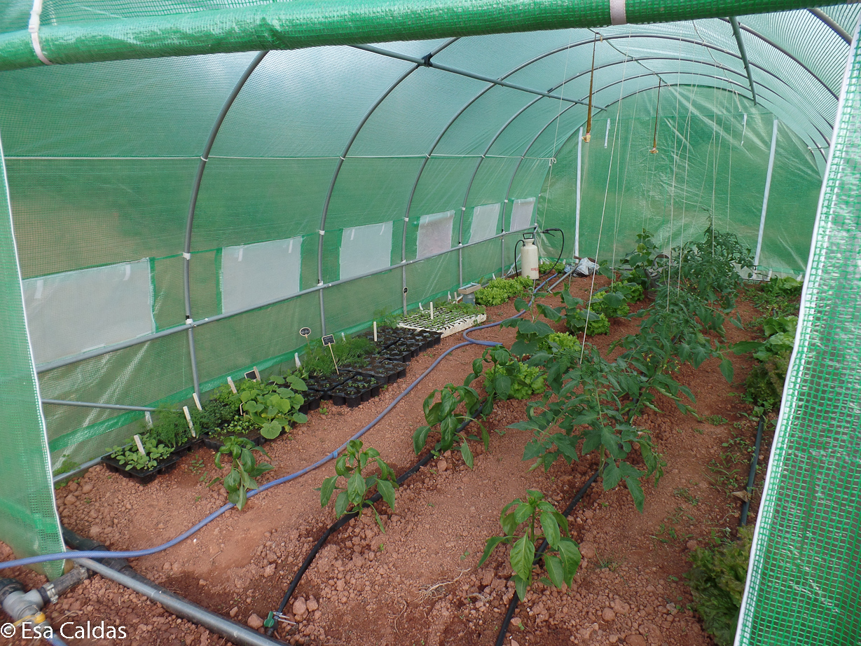 Twee winters terug heeft een windhoos een eind aan de kas gemaakt. De familie kon er niet om treuren. Vanaf het plekje waar het gevaarte stond, kijken we nu weer het ongeschonden dal met boomgaarden en eucalyptusbossen in. Maar ja, we willen niet eeuwig knolselderij uit Nederland mee nemen. Dus nu staat er een mooie groene ‘professionele’ kas, via de Portugese marktplaats (OLX) op de kop getikt.