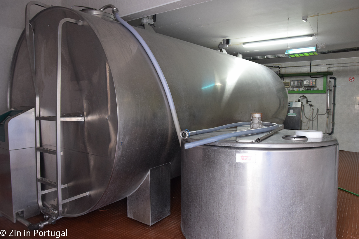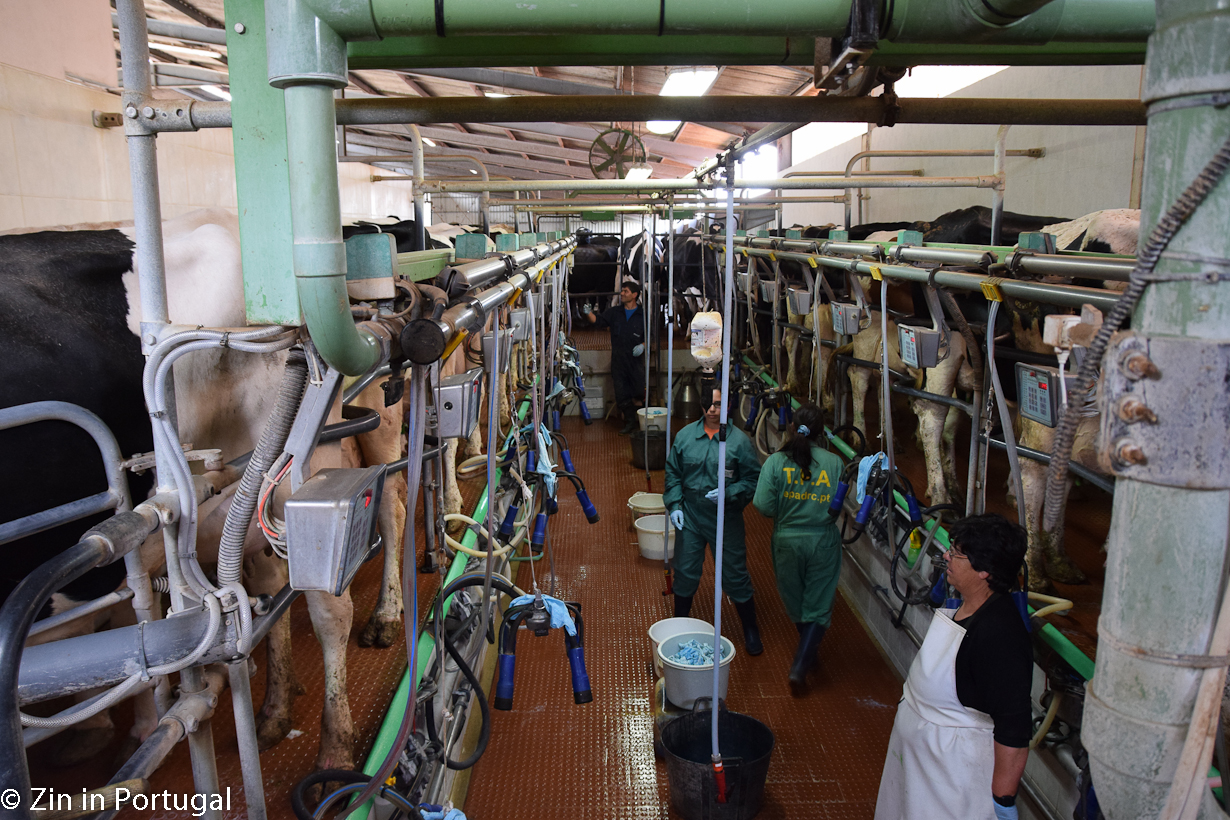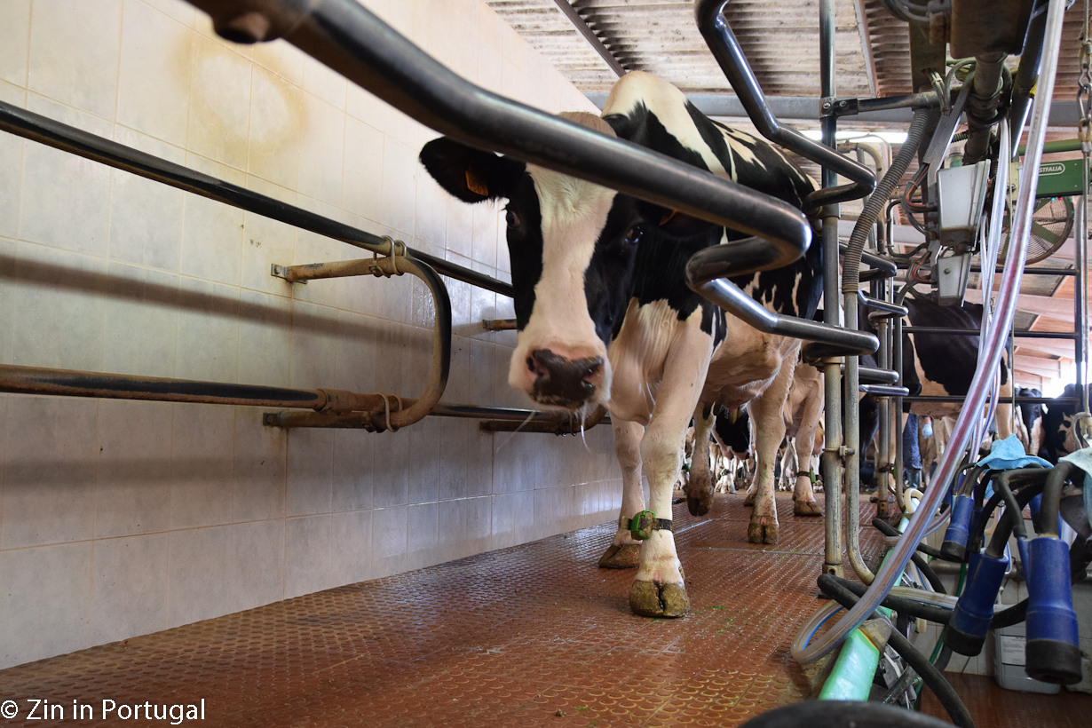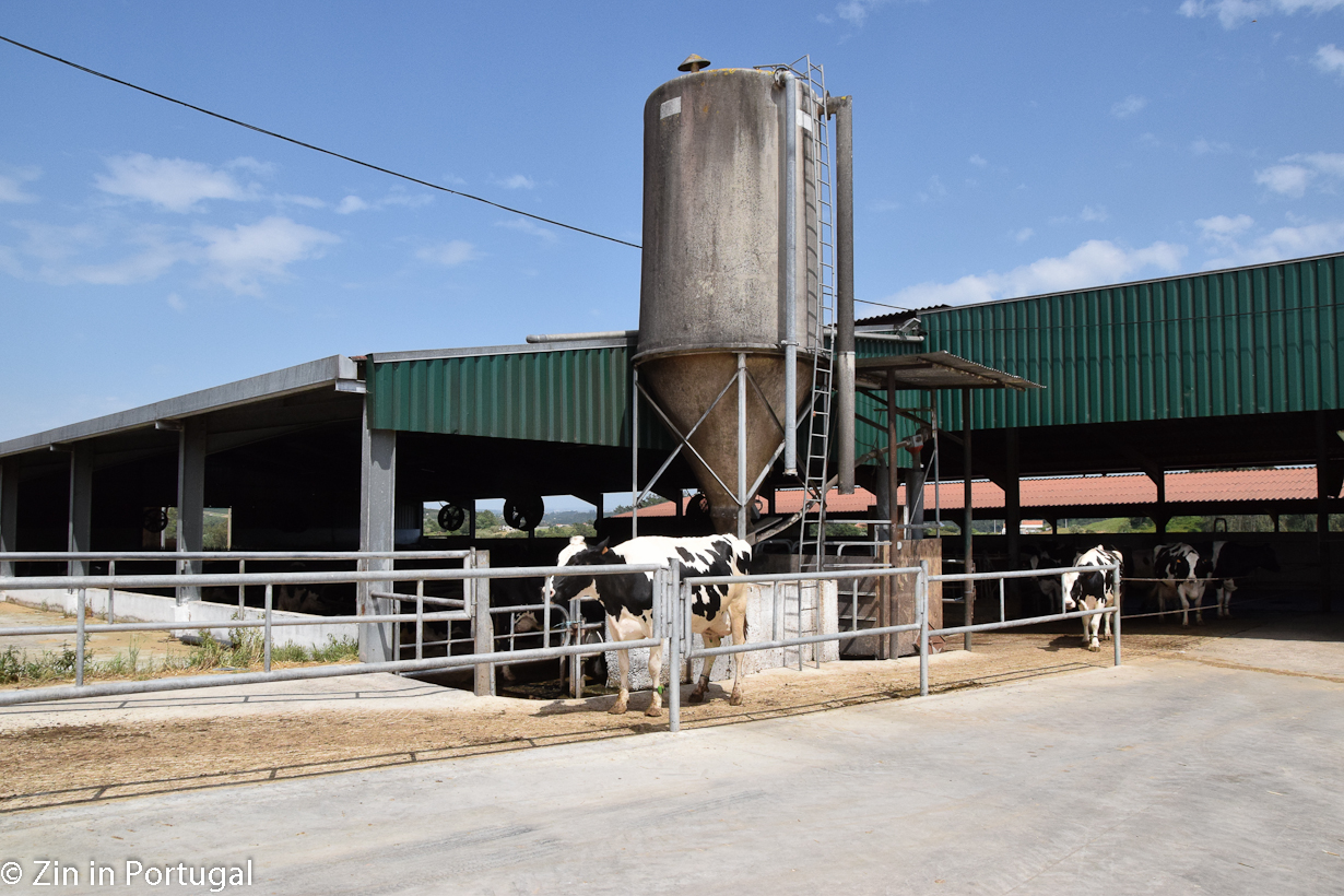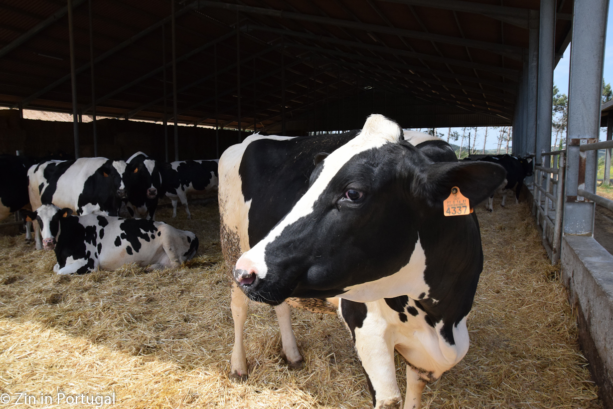 De koeien staan op stal, maar niet vast in kleine hokjes. Ze kunnen vrij rondlopen, gaan liggen, langs een borstel om hun rug te laten krabben of wat eten. De stal is een open ruimte met een dak erop. Zodra de temperatuur boven de 26 graden komt – en dat is in Portugal niet ongewoon – produceren de koeien minder melk. De dames houden niet van hitte. Begrijpelijk: hun voorvaderen komen immers uit koudere oorden. Om het in de stal bij hogere temperaturen voor de koeien aangenamer te maken gaan de grote ventilatoren aan en is er ter verkoeling van de veestapel een sproeisysteem aangebracht.