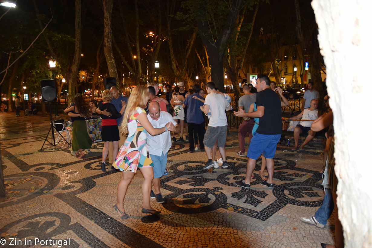 Vanaf de rustige Rua Castilho nummer 6 lopen we in enkele minuten naar de Avenida da Liberdade, waar de barretjes tot laat open zijn. Het verbaast ons dat op een doodnormale maandagavond er zo veel levendigheid is. Er wordt gedanst en veel mensen flaneren. De terrasjes zitten vol.