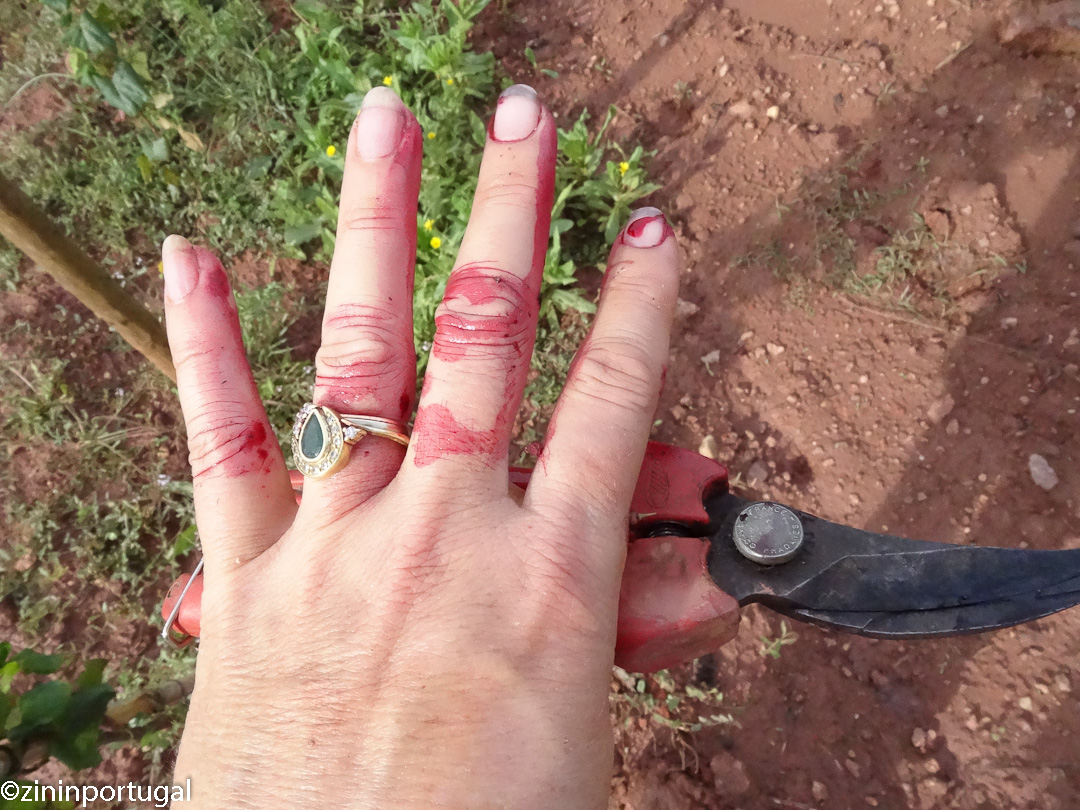 Het plukken vereist een zekere techniek. Niet dat het moeilijk is, maar volg je de techniek niet, dan loop je kans op een flinke jaap in je handpalm. Mijn Nederlandse vrienden kunnen erover mee vertellen… Een tros pak je met de ene hand van onder beet. Je drukt deze een klein beetje op en met je andere hand knip je de tros los van de stengel. Met liefde leg je de tros in een kleine emmer, die vlak bij je staat of aan je arm bungelt. Is deze emmer vol, dan giet je deze over in een grotere emmer. Houten manden zijn heel romantisch en vroeger werden ze ook veel gebruikt. Maar een plastic emmer is toch echt praktischer. Druiven willen nog wel eens plakkerig zijn en gaan lekken. Rode druiven kunnen je handen ook behoorlijk kleuren. Pluk je van het druivenras Alicante Bousquet dan zien je handen eruit alsof je net een bloedbad hebt aangericht. Dat is ook precies de bedoeling. Dit ras zorgt er later voor dat de wijn een mooie dieprode kleur krijgt.
