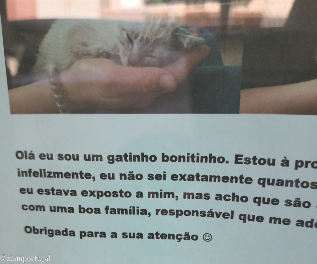 Bij Pastelaria Modelo, waar ze de lekkerste pastéis de nata mét appel maken, heeft een jong stel een briefje opgehangen. Ongeveer een maand geleden stopte er een auto in hun dorpje vlakbij Benedita : de deur ging open, er werd een ieniemiene poesje uitgezet en voor ze het doorhadden was de auto alweer met gierende banden vertrokken. Wie doet nou zoiets?
