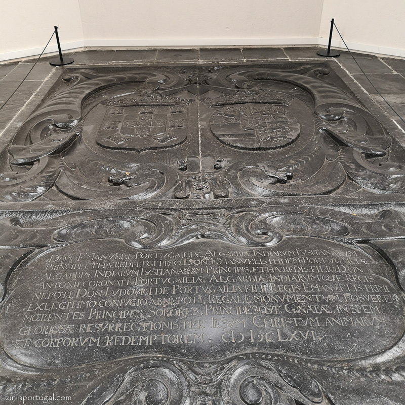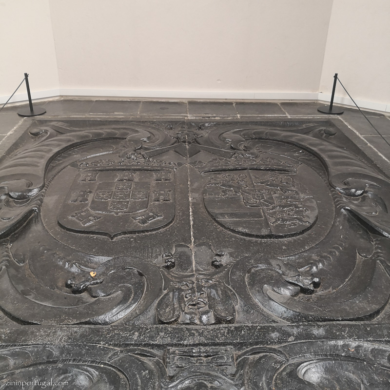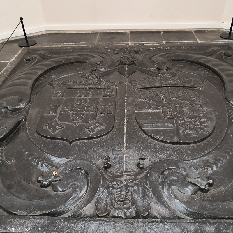 Bij binnenkomst, tegenwoordig via de Waalse kerk, struikel je zowat over een enorm graf. Mijn oog valt op het wapenschild. Hé, zie ik daar het Portugese wapenschild met de zeven kastelen en vijf schilden?