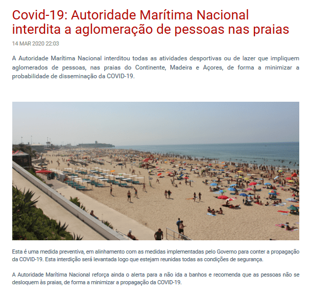 Ga niet naar het strand… De Autoridade Marítima Nacional heeft inmiddels ingegrepen om te voorkomen dat stranden een infectiehaard worden. In de tekst hieronder die zaterdagavond 14 maart om 22.03 uur gepubliceerd is, kan men lezen dat alle sportieve en recreatieve activiteiten zijn die het bijeenkomen betekenen van mensen op de stranden van Portugal continentaal, Madeira en Azoren, zijn verboden. Dit om te voorkomen dat Covid 19 zich mogelijk verspreid. Het is een voorzorgsmaatregel in het kader van wat de regering al heeft bepaald en wordt opgeheven zodra de situatie het toelaat. De Autoridade Marítima Nacional waarschuwt daarnaast om niet te baden of sowieso naar het strand te gaan.