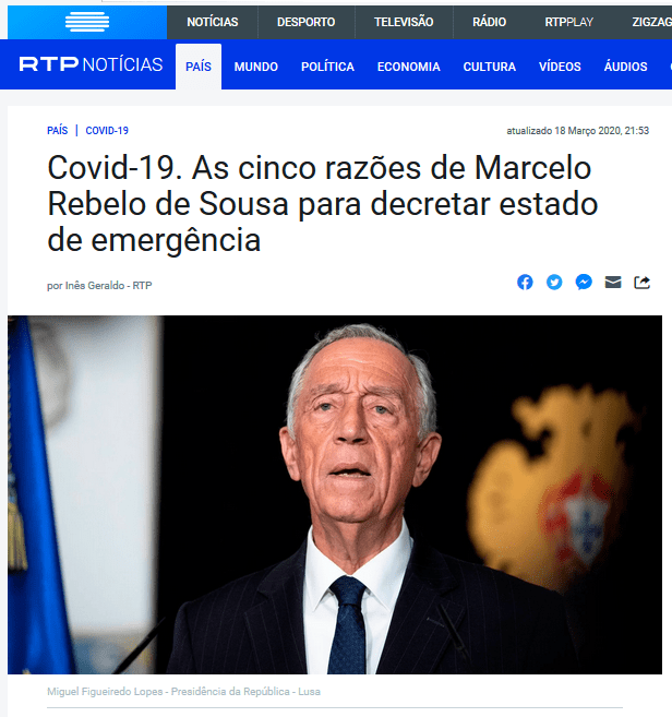 De president van Portugal benadrukt dat de “Estado de Emergência” geen onderbreking van de democratie inhoudt. Hij roept vooral op om vol te houden en niet bij de pakken neer te gaan zitten. Zwakheid en verdeeldheid zullen de strijd langer en zwaarder doen zijn. Moed, solidariteit en uithoudingsvermogen zijn er nu nodig. De strijd wordt lang en ondankbaar, maar we gaan deze zonder twijfel overwinnen, zo goed en zo kwaad als we kunnen, aldus Marcelo Rebelo de Sousa.