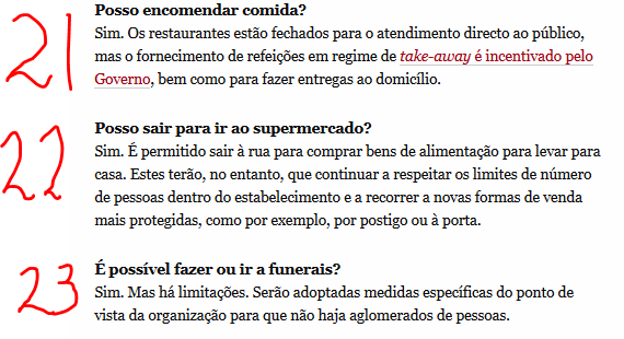 Bij de andere punten behandelt dit Pacote de Medidas (maatregelenpakket) de afstand die je als je boodschappen doet of een dienst verleent tot elkaar moet bewaren (2 meter!) en het verbod op het nuttigen van iets binnen een etablissement: