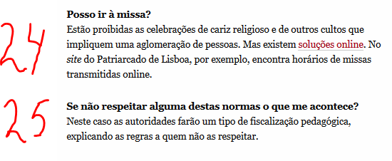 24. Mag ik naar de mis? Verboden zijn vieringen van religieuze aard of andere vereringen waarbij veel mensen bijeenkomen. Er zijn online oplossingen, de site van het Patriarchaat van Lissabon geeft de tijdstippen aan waarop je een mis online kunt bekijken.
