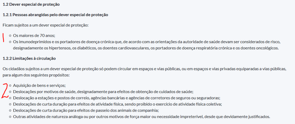 Deze speciale beschermingsplicht (‘dever especial de proteção’ kun je natuurlijk ook anders vertalen, maar ik kies ervoor om dicht bij het Portugees te blijven) is voor mensen ouder dan 70 jaar en voor mensen die in een risicogroep vallen. Risicogroepen zijn mensen met een chronische ziekte, met verhoogde bloeddruk, diabetici, hart- en vaatpatiënten, mensen met chronische luchtwegproblemen en kankerpatiënten (samenvatting punt 1). Overigens: mensen die met corona besmet zijn of bij de autoriteiten bekend als mogelijk besmet hebben sowieso thuisisolatie.