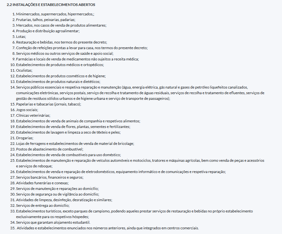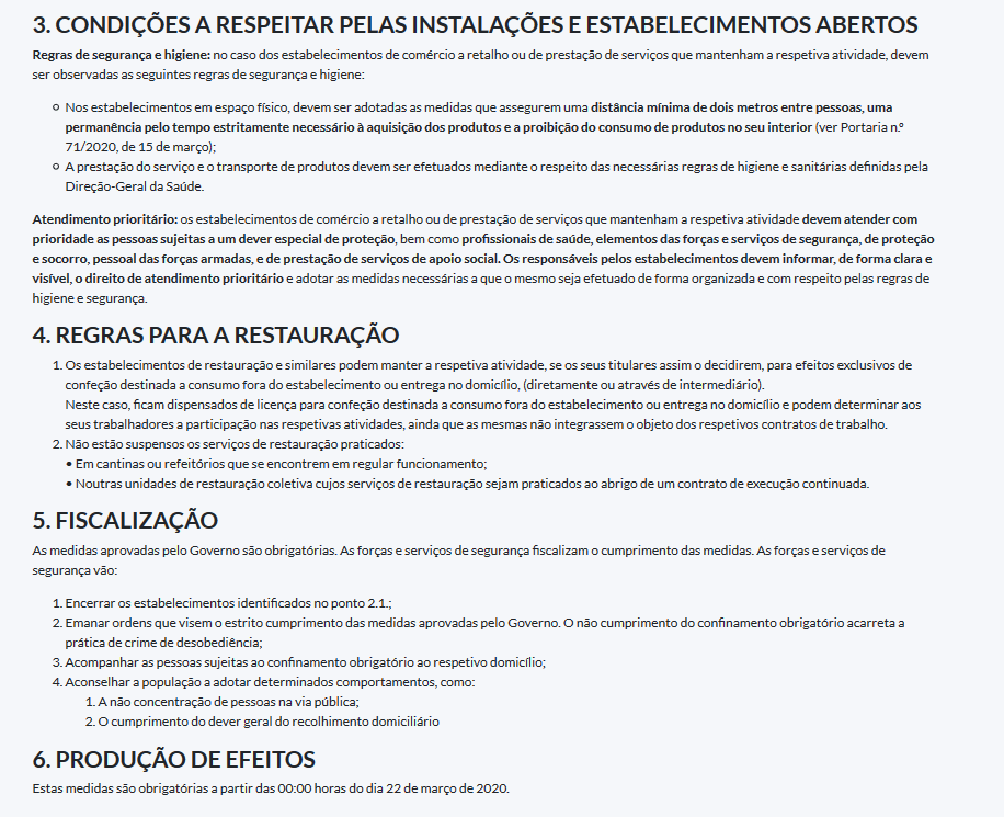 Voor wie helemaal op de hoogte wil blijven: op de site van de Portugese regering covid19estamoson.gov.pt vind je véél informatie, de allerlaatste updates, maar ook de wetsteksten die met de bestrijding van corona te maken hebben. Als je klikt op ‘Pacote de Medidas’ (pakket maatregelen) kom je op de pagina waarop alle maatregelen staan die om 00.00 uur van zondag 22 maart (vandaag dus) zijn ingegaan. Je ziet een lijst met welke zaken dicht moeten zijn en welke open mogen blijven.