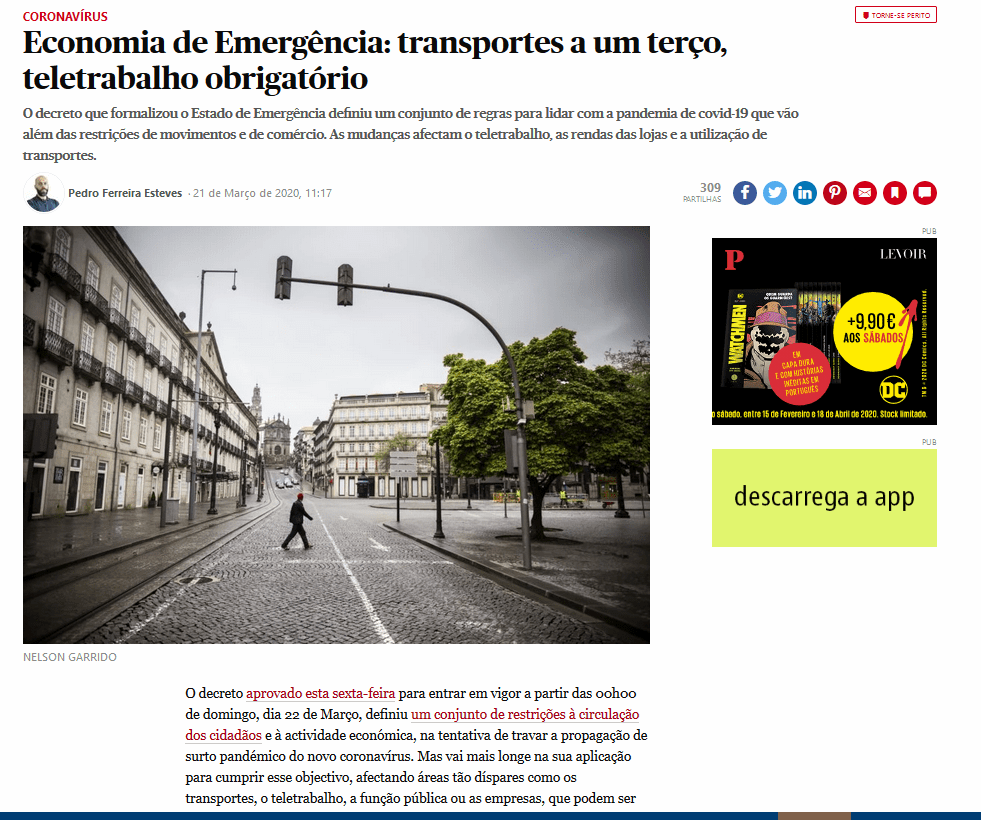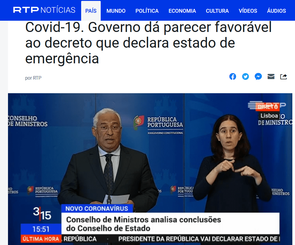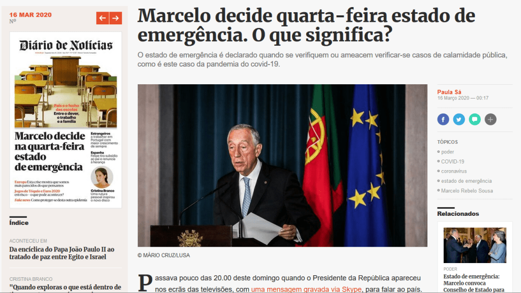 In het artikel staat dat woensdag 18 maart het Conselho de Estado om 15.00 uur bijeenkomt om zich te buigen over het wel of niet uitroepen van de noodtoestand. Bij een noodtoestand krijgt de staat verregaande middelen in handen om de persoonlijke vrijheid te beperken.