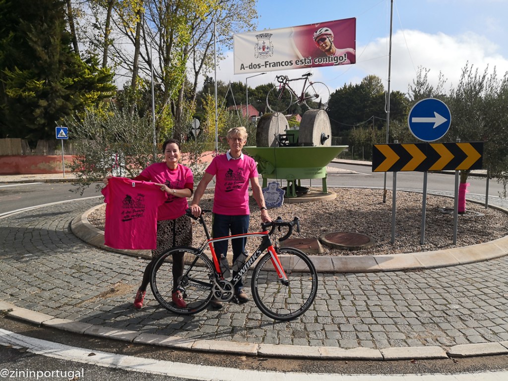 Als we vrijdagmorgen A-dos-Francos binnenrijden is een zoon uit dit dorp nog de leider van de Giro d’Italia. We zijn zo in ons sas met João dat we in het café van de Filarmónica bij een koffie en een pastel de nata spontaan roze João t-shirts aanschaffen om zondag, als hij de Giro wint (!), in rond te lopen. We zijn niet de enigen die speciaal naar A-dos-Francos tijgen. Ook wielrenners uit de buurt staan onhandig selfies bij de rotonde te maken. Ik bied aan om hen te vereeuwigen. En biets meteen een van hun fietsen voor een foto van onszelf. Dus daar staan we dan trots te wezen voor de familieapp. Achter ons prijkt fier het spandoek ‘A-dos-Francis is met je!’. Even de Hollandse tak de oogjes uitsteken. Aan het eind van de dag weten we beter. Had ik nou maar mijn mond gehouden… Op de Hollandse familieapp zijn ze er als de kippen bij om het nieuws te melden: João is geKelderd. Kelderman leidt nu, een Hollander!