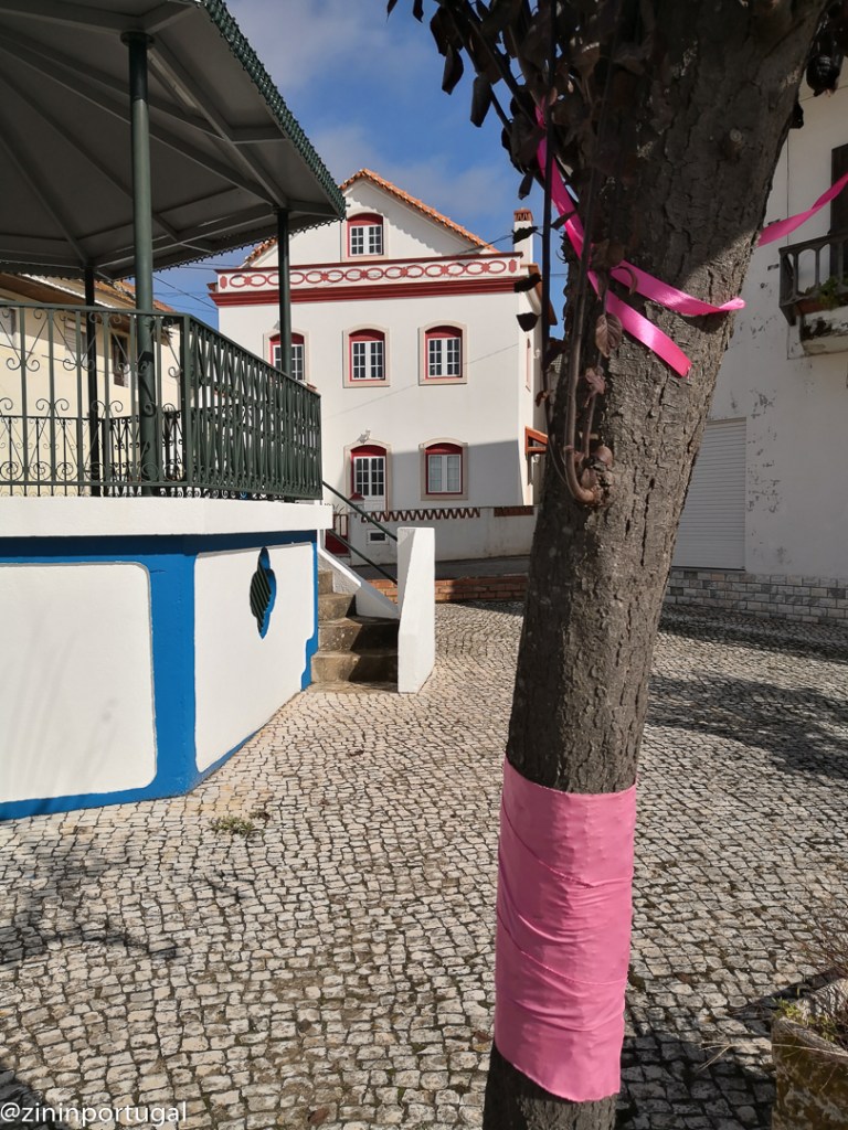 A- dos-Francos is een freguesia, deelgemeente, van Caldas da Rainha. Nu snap ik waarom alle beelden van de Bordallo Pinheiro- route met roze sjaals zijn versierd. Zelfs om onze good old Rainha Leonor, de koningin die Caldas stadsrechten ooit heeft verleend, hebben ze deze dagen een roze cape om haar schouders geknoopt. En ik maar denken dat deze sympathieke actie vanwege 11 oktober, de internationale coming-out-day, was.