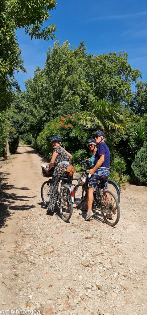 We staan foto’s van het betegelde huis te maken als ons oog op het perceel ernaast valt. Even een kijkje nemen. Voor we het weten hebben we fietsen (10 euro voor 4 uur) gehuurd en rijden we het pad af de enorme wijn-, peren- , appelgaard erachter in. Het plan: via de Quinta das Cerejeiras naar Quinta do Sanguinhal fietsen. Omdat we tassen bij ons hebben en de mountainbikes geen mandjes hebben, neem ik het allerkleinste fietsje waar een mandje voor op zit. Pas als ik op de fiets stap, denk ik ‘wat ben ik toch een oen’. Maar goed, je hebt Hollandse roots of niet, dus ik laat me niet kennen en fiets dapper mee. Al zal ik eerlijk bekennen dat ik het ding met die drie versnellinkjes niet de heuvel op heb gekregen. De heuvel op loop ik, want ik ben geen João Almeida (voor wie deze Portugese wielrenner uit deze contreien nog niet kent: lees mijn blogpost over hem!).