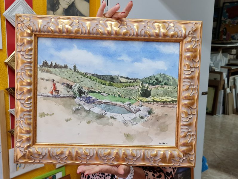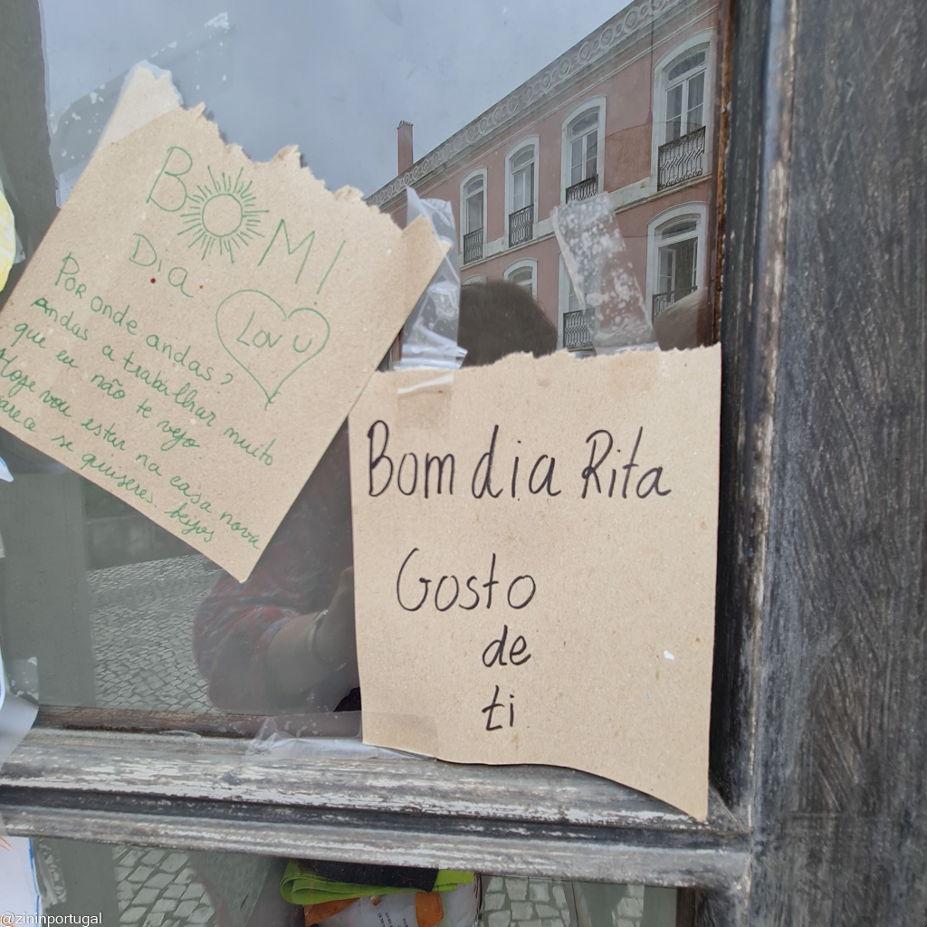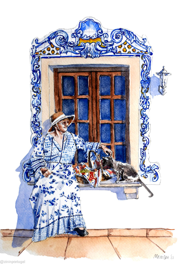 “U bent de eerste die er een koopt, mevrouw”, spontaan koop ik er nog een en Rita Manique, de jonge kunstenares, die naast me loopt ook een. We hebben nét samen bij Quadrolar een paar ingelijste aquarellen van haar hand opgehaald. Rita Manique (neem eens een kijkje op haar Instapagina!) is bezig met een Mestrado (Master) Industrial Design hier in Caldas da Rainha en in opdracht aquarelleert ze huizen en mensen. Soms zie je haar in de straten als urban sketcher dan schetst ze de mooie panden uit de glorietijd van deze stad.