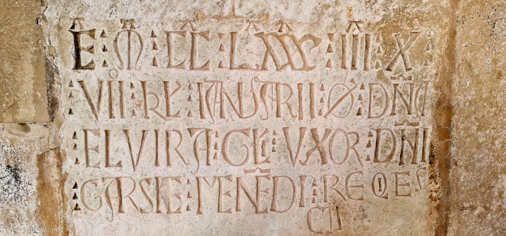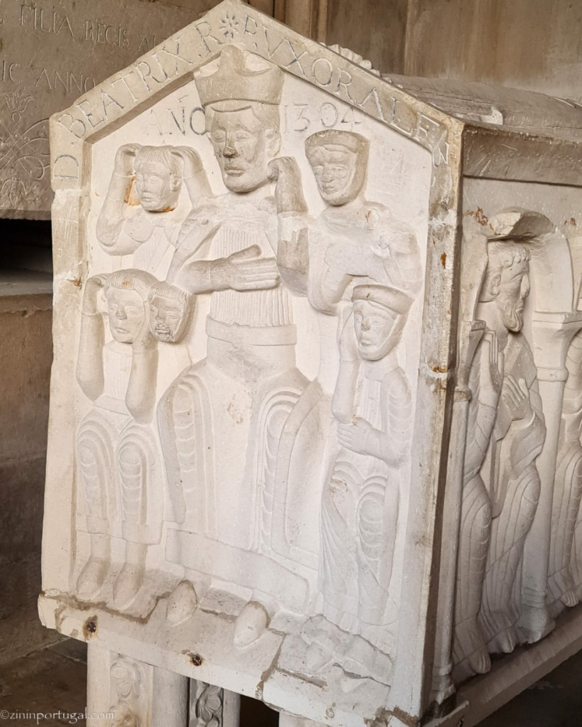 De sarcofaag wordt door historici nu uit ongeveer 1220 gedateerd (en niet volgens de inscriptie aan het voeteinde uit 1304). Ik lees in Hoogtij der Middeleeuwen dat we “bij de voeten van de dode koningin een jammerscène zien. Haar man, Afonso II, beweent zijn vrouw, de rechterhand ligt op zijn borst en met de andere trekt hij aan zijn baard of haar. Rond hem staan de infanten (koningskinderen) Sancho, Afonso, Fernando en Leonor, plus de gouvernante van Fernando.” Ik licht het voeteinde nog een keer groot uit. In de rand zie je duidelijk de inscriptie D. Beatrix en naast de kroon links ano en rechts 1304.