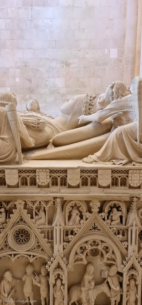 Inês de Castro ligt, gekroond als koningin en door engelen ondersteund, in de andere vleugel van de kerk. Pedro en Inês liggen met de voeten naar elkaar, zodat ze elkaar op de Dag des Oordeels meteen weer in de ogen kunnen kijken, net als toen (lees meer over Pedro en Inês en over mijn verwondering als kind dat ze zo ver uit elkaar lagen in Hoe zat het ook alweer met Pedro en Inês? ).