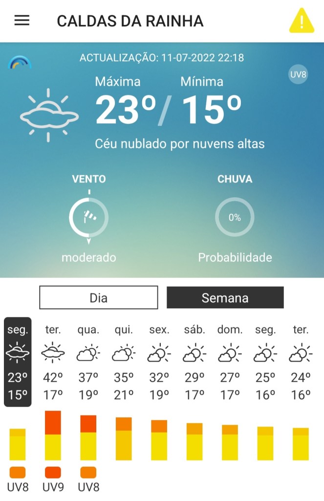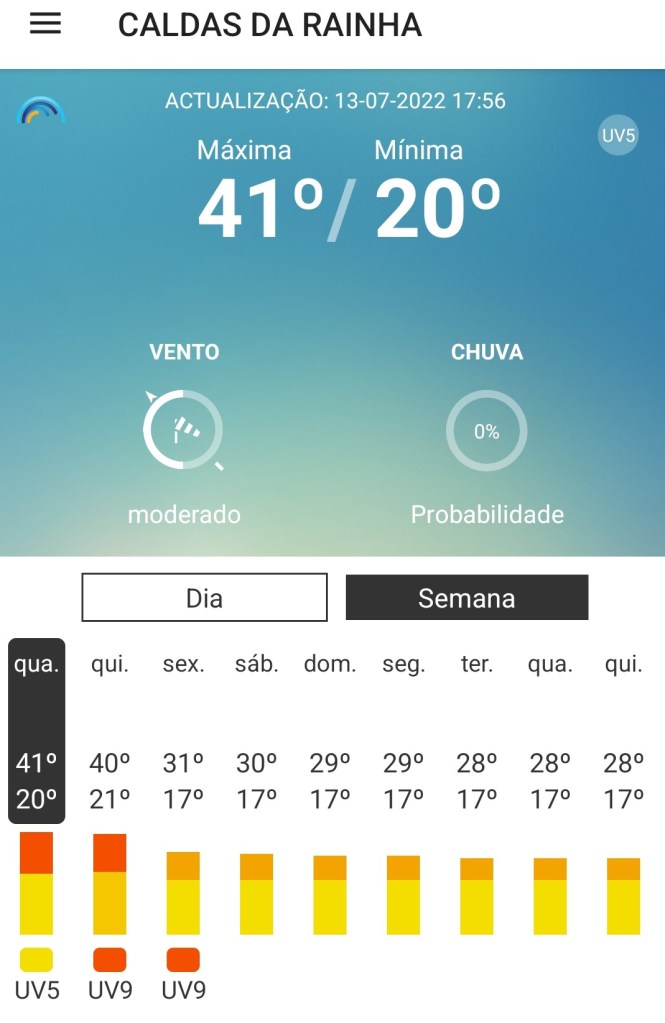 Ik ben een groot fan van IPMA.PT en doorgaans zijn hun voorspellingen heel betrouwbaar, daarom schrok ik ook toen ik maandag 11 juli naar de voorspellingen voor Caldas da Rainha voor deze week keek. Dát kon niet waar zijn!
