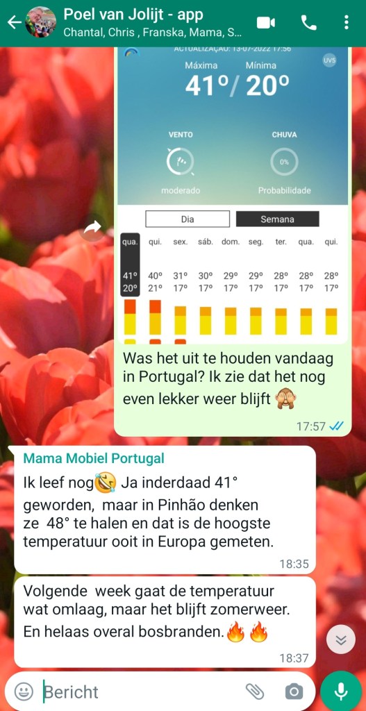 Op alle verontruste appjes in onze levendige Portugees/Nederlandse/Engelse familie- en vrienden appgroepen waarin vanuit Noord-Europa zorgen over deze uitzonderlijke hitte in het zuiden worden geuit, antwoordt mijn immer zonnige moeder van 82 gelukkig het volgende: