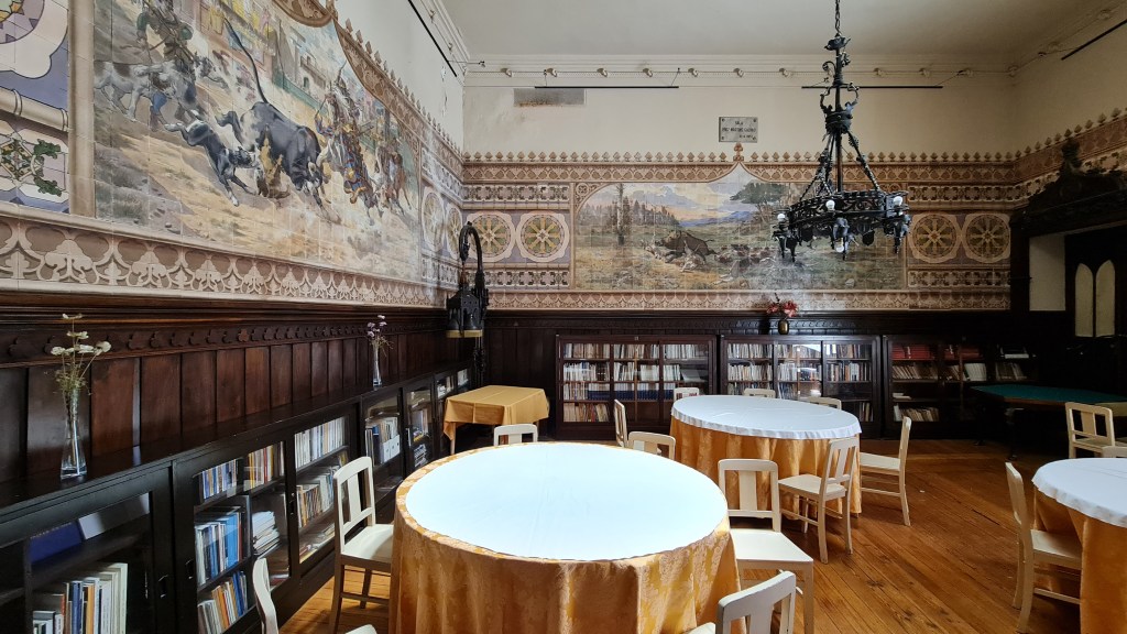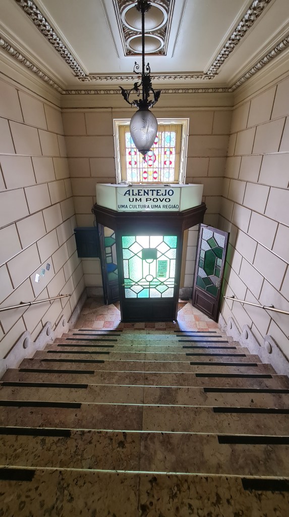 Wil je ook een keer hier eten? Het restaurant zit aardig verstopt, dus bij dit beeldverhaal een foto van de deur en hoe je vervolgens bij het restaurant aan de Rua das Portas de Santo Antão 58 komt. Wij hadden niet gereserveerd, maar wil je zeker zijn van een plekje of eten in een bepaalde zaal, dan is reserveren verstandig. Ze hebben twee zalen, één met kleurrijke tableaus aan de patio en één met blauwwitte tegeltableaus. Verder is er een schitterende balzaal. Dus heb je iets groots te vieren? Deze zaal in hartje Lissabon, vlak achter de pleinen in de Baixa Lisboeta lijkt me helemaal geweldig! Voor reserveren of meer info ga je naar : Casa do Alentejo