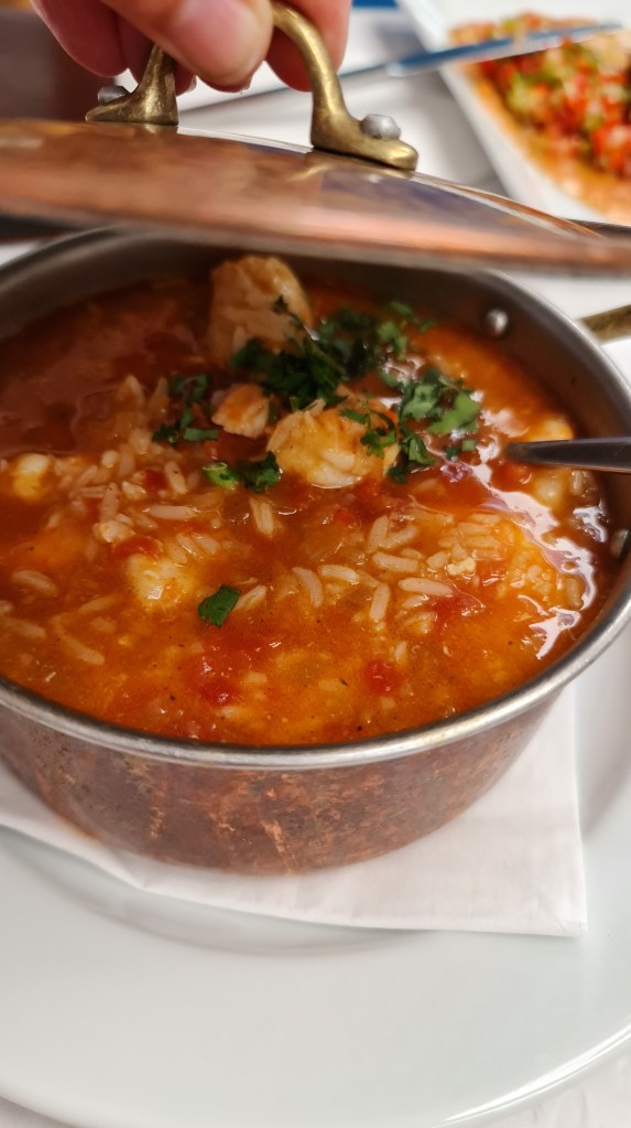 De tonijn is ook goed, maar steekt wat ‘gewoontjes’ af tegen de andere gerechten. Omdat ik een vrij zware behandeling aan mijn gebit heb ondergaan en ik van de tandarts alleen ‘zacht voedsel’ mag eten, ben ik voor de Gazpacho Alentejana gegaan. Bij gazpacho denk je aan gepureerde koude tomatensoep, maar dit is een wat flauwe heldere bouillon met kleine stukjes tomaat, paprika en ui. Ik was er niet zo weg van en al helemaal niet omdat mijn tafelgenoten werkelijk goddelijke maaltijden hadden.