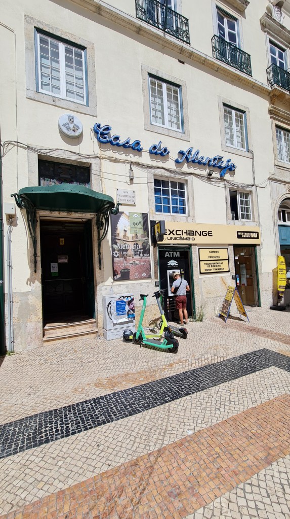 Op dit plein stappen we op de metro terug naar het plein Restauradores. En dan gaat het mis, we zien de metro aankomen, de dames in her gezelschap die voorop lopen roepen ‘rennen’ en zetten er de pas in. Mijn man ziet in het donker op de trap een trede niet en valt lelijk. Sorry, lieverd 😥. Haastige spoed, zelden goed: enkel verzwikt en zere schouder. Na de eerste schrik en constatering dat lopen ‘nog wel gaat’ (met pijn) besluiten we de metro alsnog naar Restauradores te nemen en daar een farmácia (apotheek) te zoeken voordat we naar de Benficawinkel in de Rua das Portas do Santo Antão (nummer 55) gaan. Met een drukverband om wandelt onze bikkel meteen weer een stuk beter.