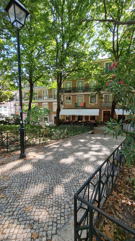 Terwijl mijn man aangenaam verpoost in het parkje bij het uitkijkpunt, lopen wij nog een klein rondje in de buurt. Ik ben dol op het pleintje Praça do Príncipe Real op een steenworp afstand van het uitkijkpunt. Natuurlijk kun je vanaf het uitkijkpunt ook de Bairro Alto ingaan, maar ik ga liever naar een stuk waar je het echte leven in Lissabon ervaart. Het pleintje van Príncipe Real is prachtig met oeroude bomen en omringd door aardige gebouwen. Loop even naar binnen in het stadspaleis waar Embaixador op staat (daar is trouwens een toilet!) of drink koffie met chocolade in het ieniemie topzaakje van Bettina & Niccolo Corallo, gevestigd in het oude pand van Casa das Cortiças. Beter nog : neem op een warme dag hun chocolade-ijs. Je moet er echt even naar vragen, want staat niet aangegeven. Daarna wordt er ter plekke het lekkerste donkere chocolade sorbetijs dat je ooit zult proeven gemaakt : zacht, zonder ijskristallen!