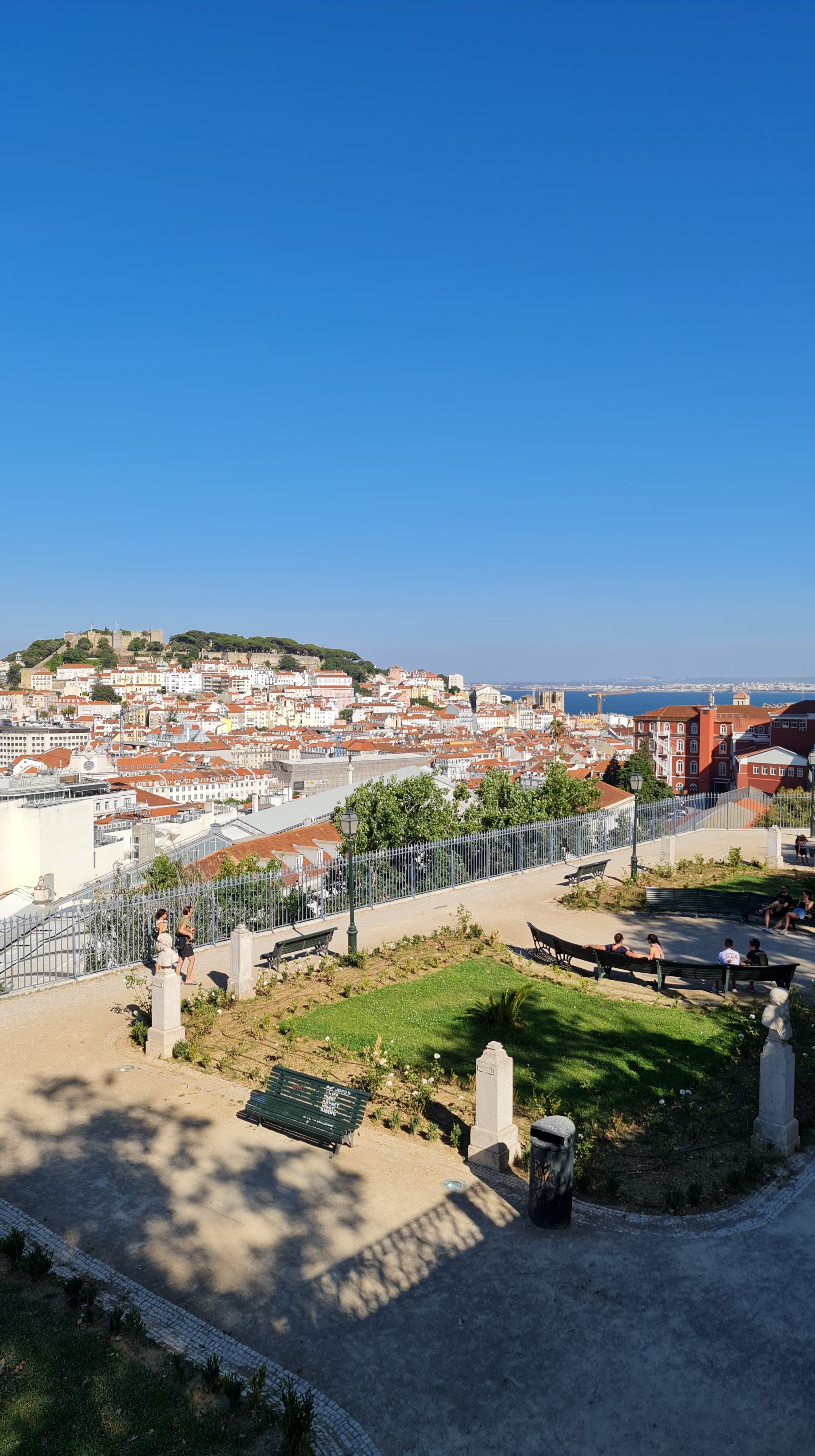 Wat doe je met iemand in je gezelschap die een verstuikte enkel heeft? Dan zoek je een lekker plekje! We nemen het gele ‘elevador’ naar boven richting het uitzichtpunt van de Miradouro de São Pedro de Alcantâra, waar de zielepiet lommerrijk over de stad kan uitkijken en zijn zere voet in koud water kan koelen.