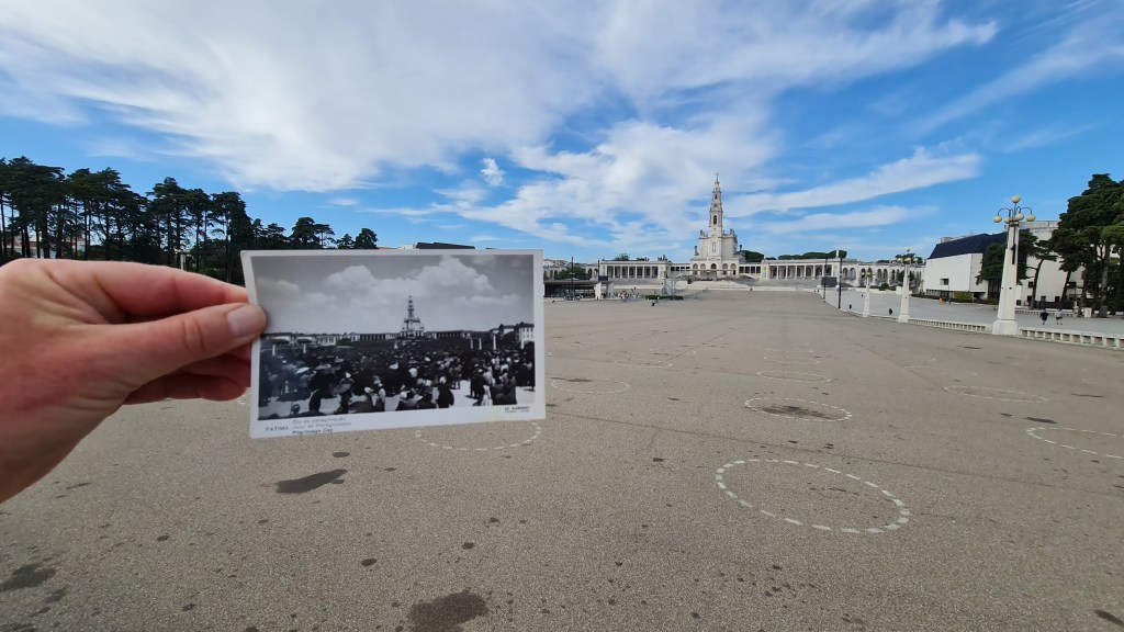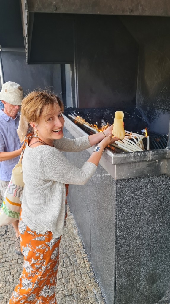 Terwijl ik in Fátima bij het vuur waar de kaarsen worden gebrand met mijn kaarsenvoetje sta, constateer ik dat er blijkbaar linker- en rechtervoeten zijn. Toen ik mijn voet kocht in het winkeltje met religieuze artikelen heb ik dat kleine detail over het hoofdgezien. Wat suf! Nu sta ik hier met een rechtervoet en het is toch echt de linkervoet die in Lissabon verstuikt is geraakt 🙈.