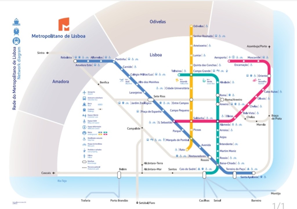 Om vanaf Gare do Oriente naar de Baixa, downtown Lissabon, te komen, nemen we de rode lijn en stappen we op Alameda over op de groene, richting Rossio – eindpunt van deze lijn is Cais do Sodre (treinstation met treinen naar de badplaatsen zoals Estoril en Cascais) .