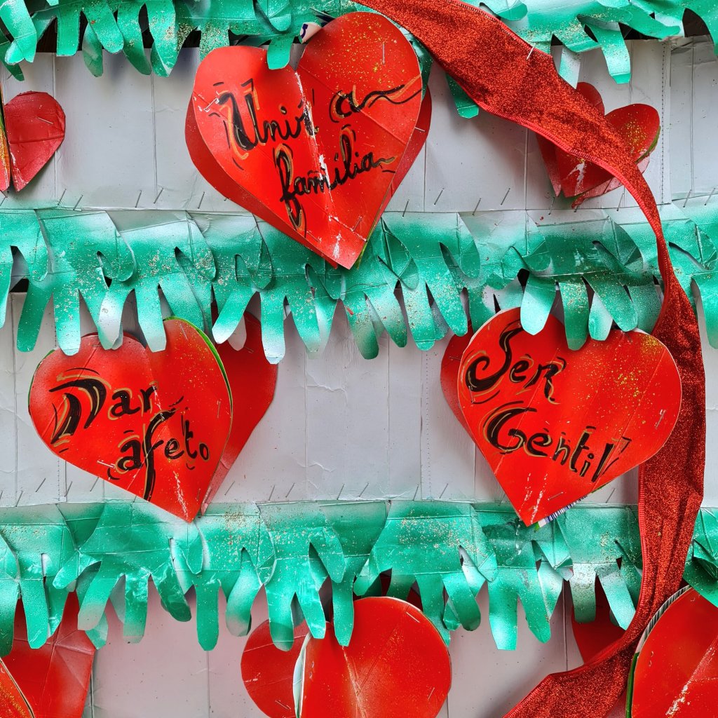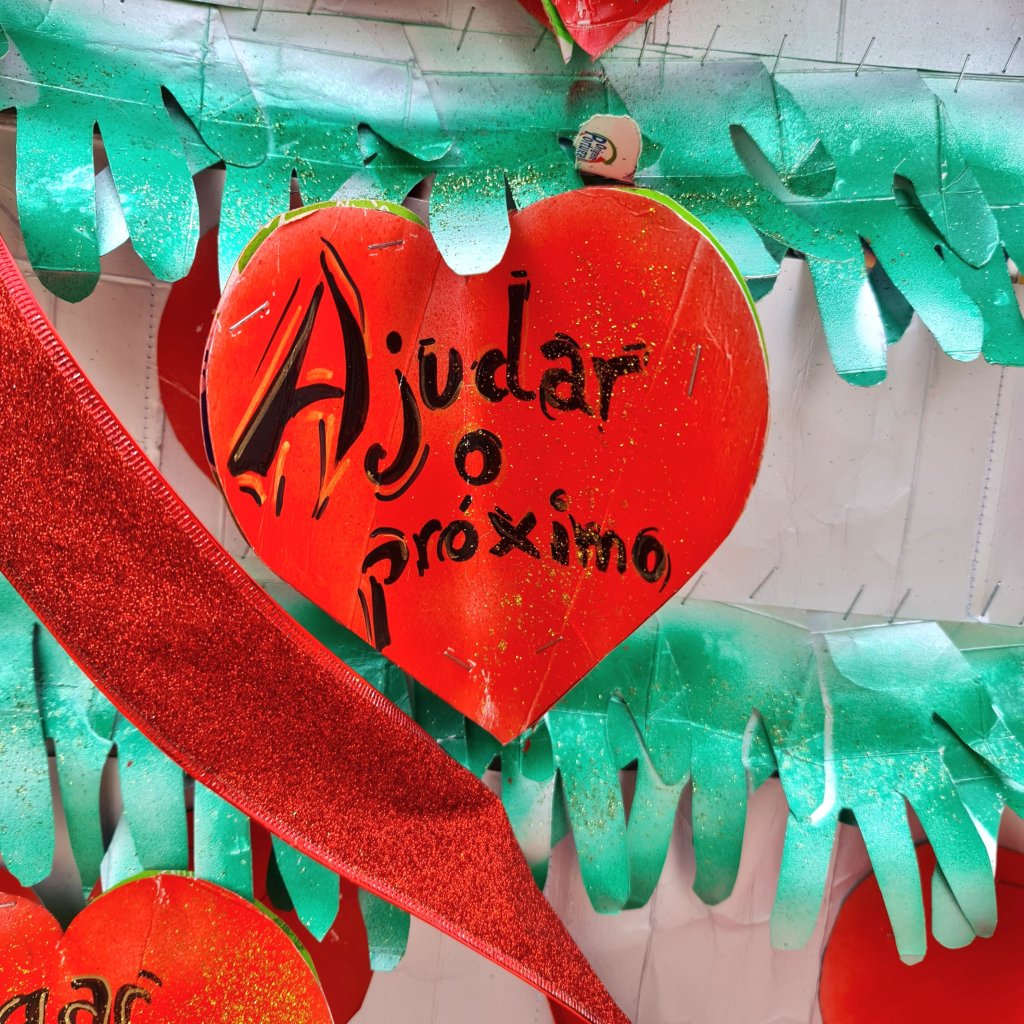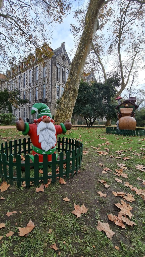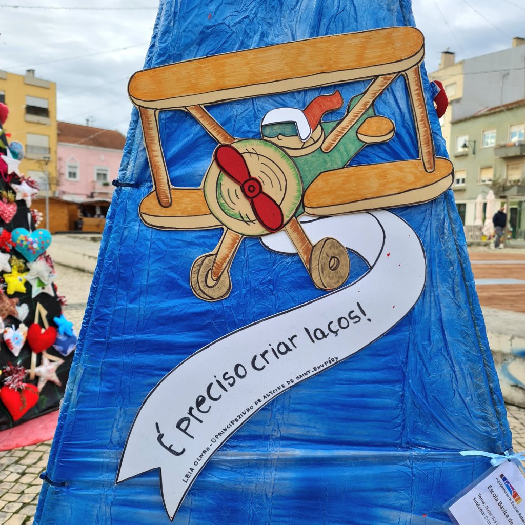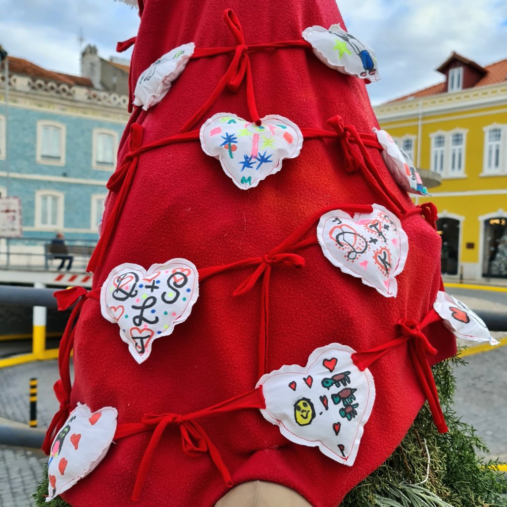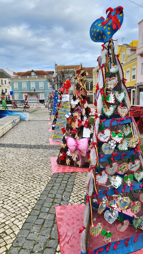 De kerstbomen van de basisscholen staan dit jaar op de oude vismarkt (Praça 5 de Outubro). Het plein waar de jeugd tot laat in de avond chillt is nu de plek waar de toekomstige jeugd lieve woordjes in bomen heeft hangen. Ik smelt bij wat ik lees. Deze kleintjes willen ‘criar laços’ (emotionele banden maken kweken) , ‘dar afeto’ (affectie tonen ), ligar corações (harten verbinden) en ‘ajudar o próximo’ (je naaste helpen).