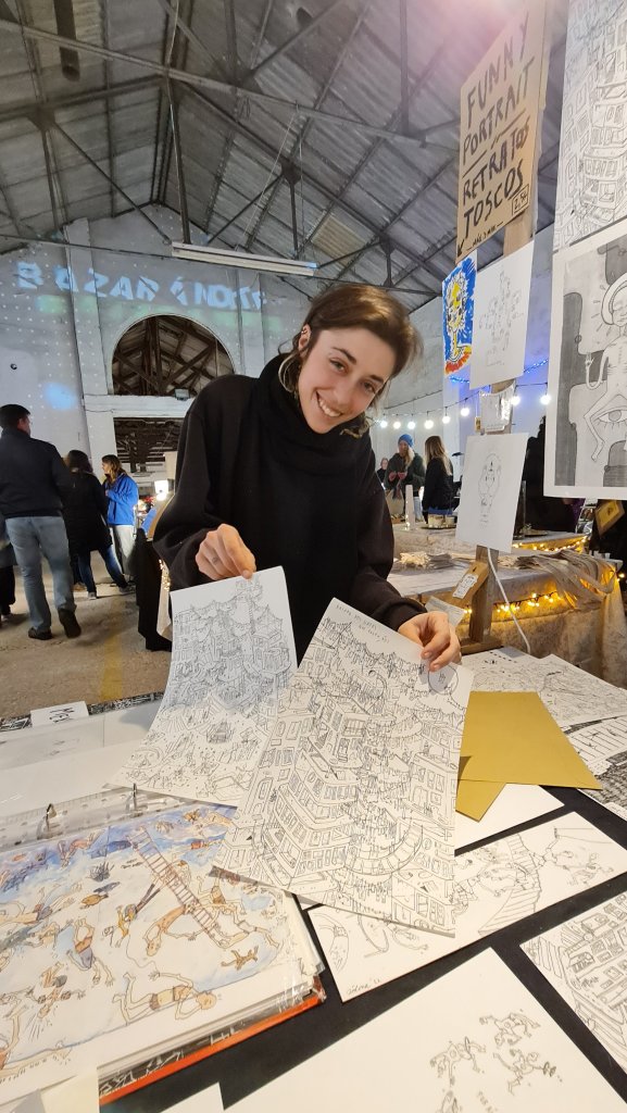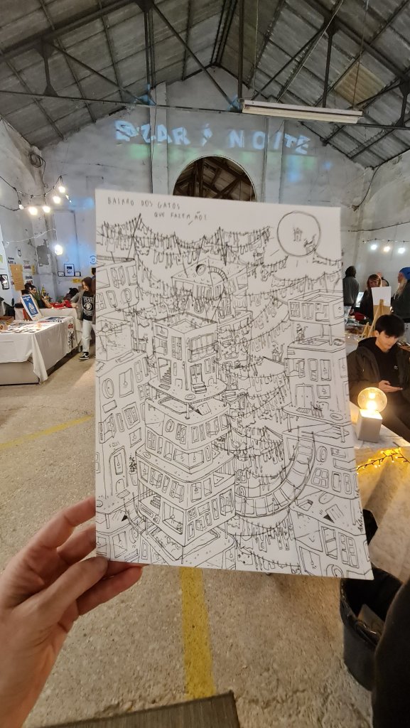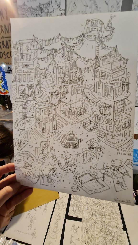 Op Insta volg ik al een poosje Só Luna. Ik had haar op een van de vorige edities van de Bazar à Noite al eens zien tekenen. Haar werk doet me aan Escher met een vleugje Jan van Haasteren denken. Ze gaf aan ‘wel eens van Escher gehoord te hebben’, maar haar inspiratie te halen uit scènes uit het dagelijks leven en altijd, altijd ! aan het tekenen te zijn. Wat lijkt me dát heerlijk! Ik ben weg van de twee tekeningen, één vol met katten (dan heb je me al gauw) en één met de prachtige titel ‘amor preenche’ (liefde vult).