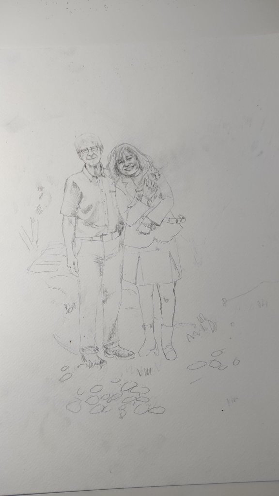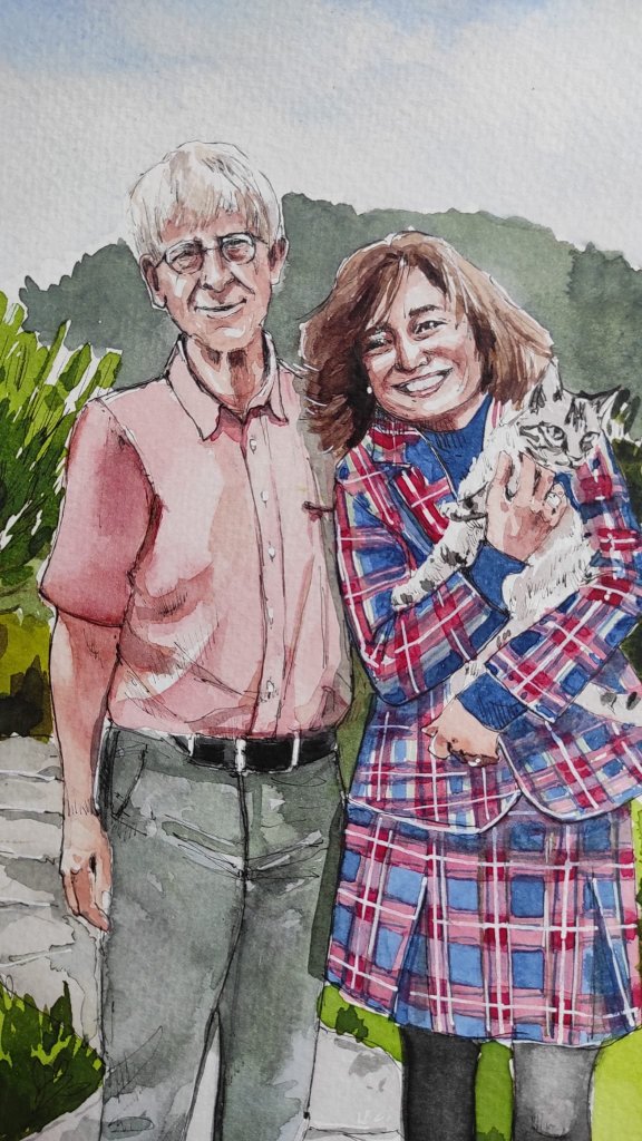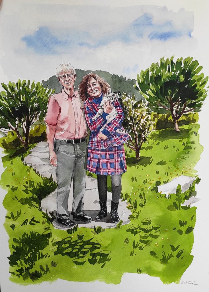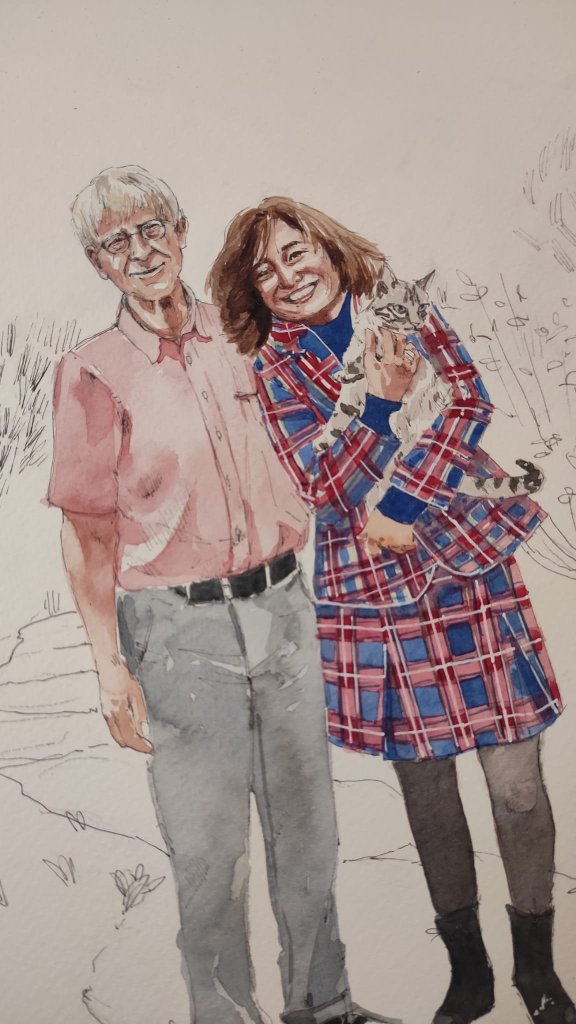 Vandaag gaan we lunchen met mijn moeder en tia. Mijn moedertje vroeg zich gisteren af waarom zij nou in godesnaam mee moest op onze trouwdag. En waarom tia ook uitgenodigd was. Het zit zo mam: jullie aanwezigheid verschaft me de mogelijkheid om zonder dat manlief argwaan krijgt nóg iemand uit te nodigen. Want…. al weken ontvang ik steeds een update van de vorderingen van het portret van ons twee dat Rita Manique aan het aquarelleren is.