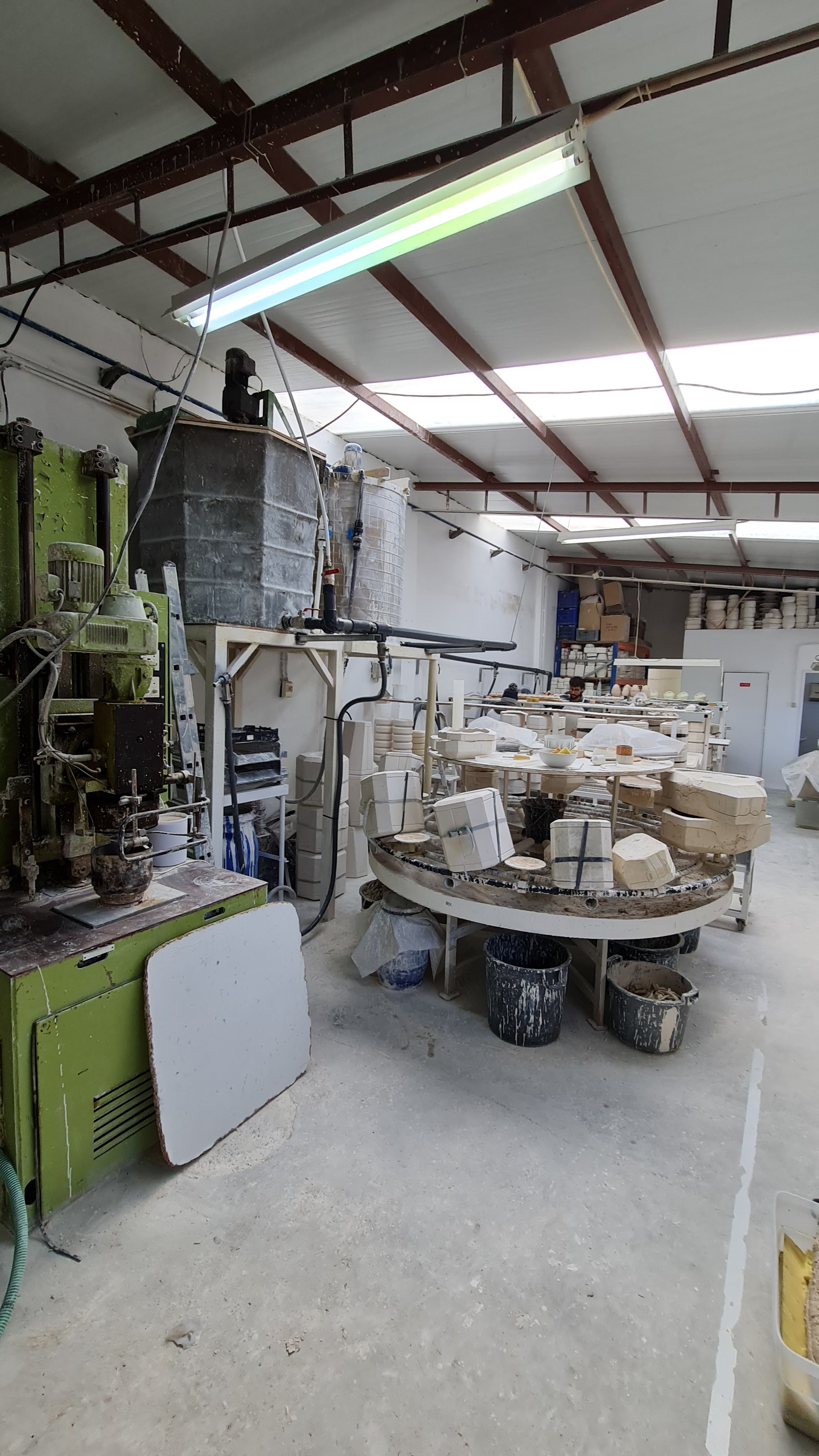 Ik heb dus Braz Gil Studio gemaild. De ietwat verscholen porseleinfabriek op de heuvels van de stad ligt op de route die ik neem als ik naar Caldas da Rainha rijd. Tussen het districtsziekenhuis, het voetbalstadion en de rotonde van de pastelkleurige huizen ligt Braz Gil Studio. Mijn bezoek heb ik aangekondigd, want ik wil graag het hele proces bekijken. En ik bof, Inez Braz Gil, de kleindochter van de oprichter, wil me graag ontvangen en tot mijn verrassing roept ze er al snel haar opa bij als ik een vraag stel over het verschil tussen porselein en keramiek.