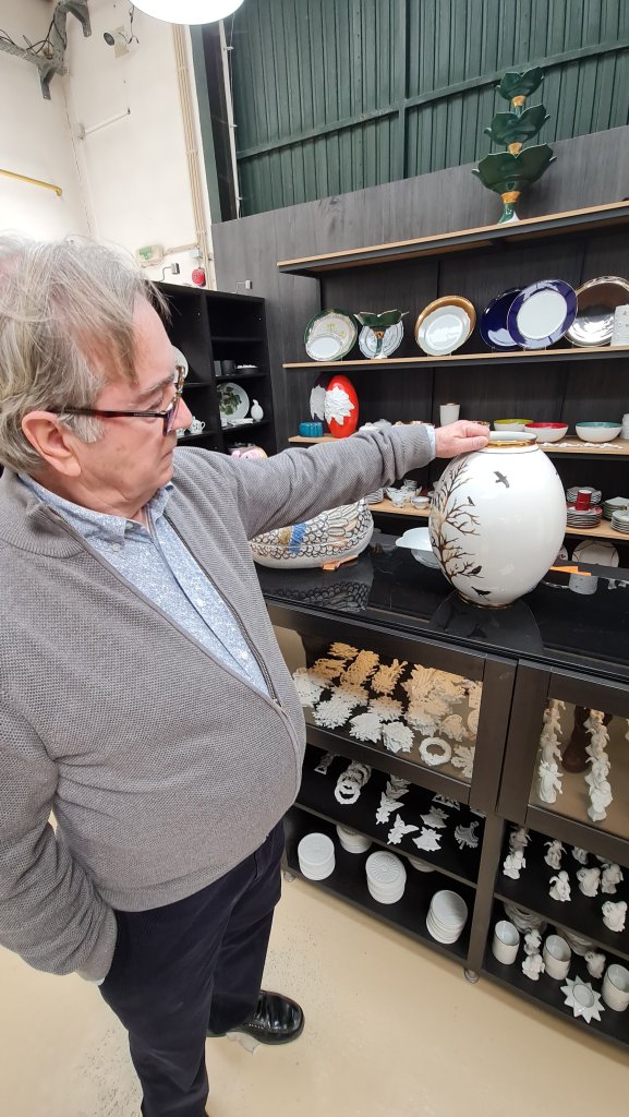 Gelukkig zijn er ook fabrieken die het wél hebben gered en het uitstekend doen. Zo staan er in de zomer vaak rijen bij de winkel van Bordallo Pinheiro en Molde op het industrieterrein is ook nog in bedrijf. Over Bordallo Pinheiro en de keramiekroute langs de beelden her en der in de stad heb ik al eerder geschreven. Dit verhaal gaat niet over keramiek, maar over porselein. En dat is toch écht andere koek, vertelt de oprichter van Braz Gil Studio, Joaquim Braz Gil. Porselein is doorzichtig, kwetsbaar, een luxe-artikel. Hij is zijn bedrijf in 1996 begonnen. Sommige werknemers werken er al sinds de oprichting. Nieuwe mensen leiden ze zelf op. Het werken met porselein vergt goede motorische vaardigheden. Elke object moet perfect zijn. Als ik samen met grootvader en kleindochter Braz Gil de verschillende productiestadia doorloop, zie ik werknemers geconcentreerd en voorzichtig de tere witte baksels bewerken.