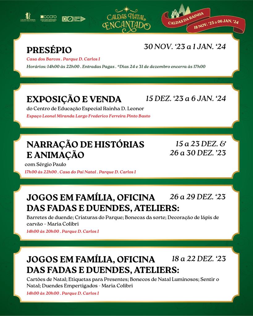 Kan een afbeelding zijn van de tekst '0 CALDASATAL ENCANTADO CALDASDARAINHA 18NOV. 23 06JAN. 24 T NATAL NO PARQUE MERCADO DE NATAL 1A31DE DE DEZEMBRO PARQUE D. CARLOS Horário Dez.: 14h00 22h30 24 31 Dez.: 14h00 18h00 25 Dez. 15h00 Jan.: 22h30'