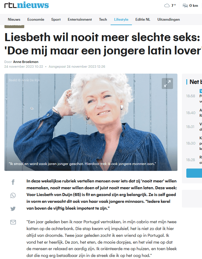 Wil je het hele artikel van 24 november op RTL Nieuws lezen? Klik dan op Liesbeth wil nooit meer slechte seks: ‘Doe mij maar een jongere latin lover’