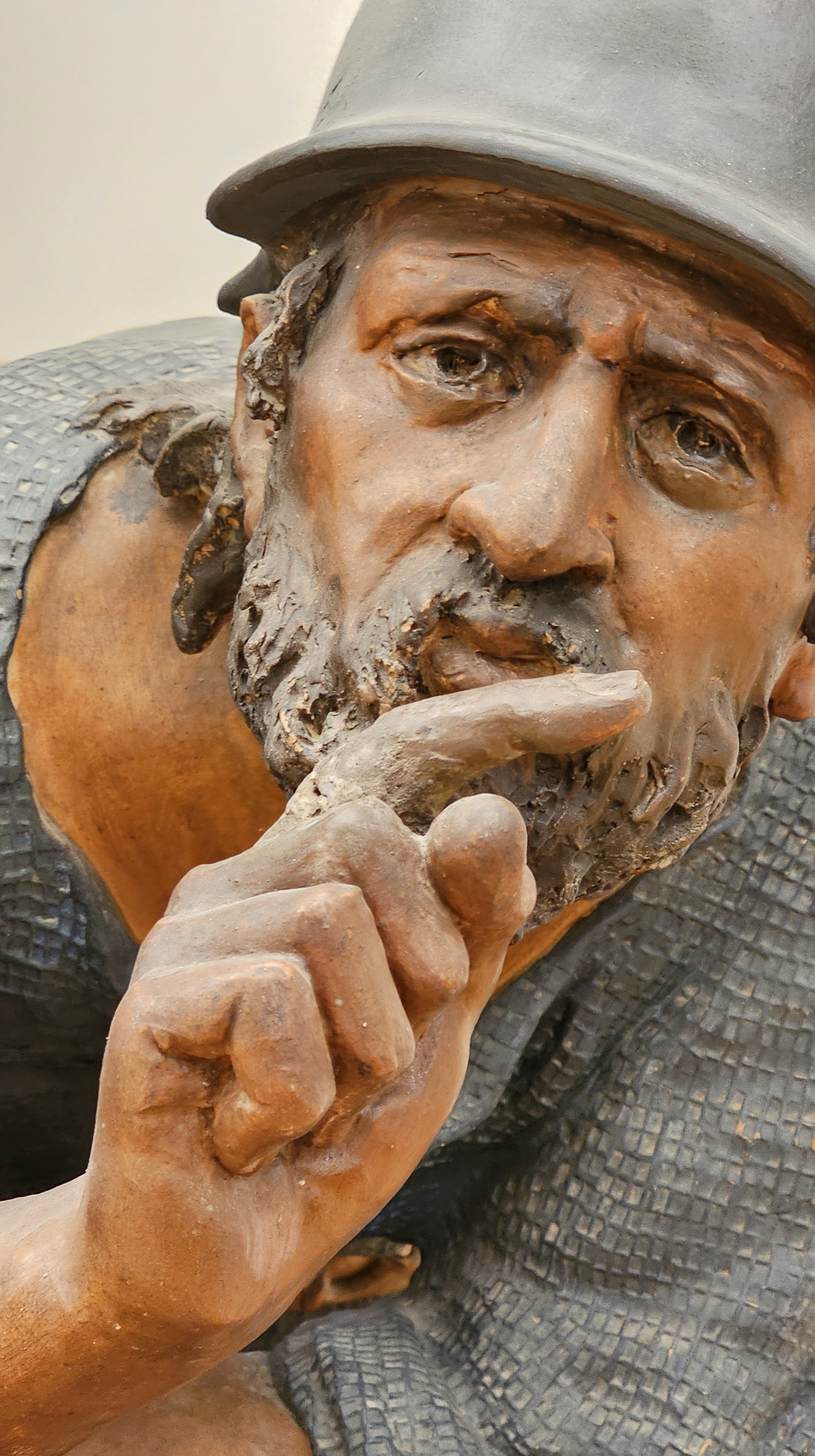 Op die Bazars à Noite en bij exposities ervaar ik telkens weer hoe kunstminnend een klein provinciestadje als Caldas da Rainha eigenlijk is. En hoe bescheiden de kunstenaars zijn, dat ook. Veel te bescheiden, denk ik wel eens. Frappant is dat we jaren geleden eens kennismaakten met een Hollandse beeldhouwer die op kosten van de gemeente met Simpetra, een beeldhouwfestival, meedeed. In de jaren vóór corona kregen kunstenaars een blok steen en mochten ze er van maken wat ze wilden. Vervolgens werden die kunstwerken op de rotondes tentoongesteld. Ik heb de indruk dat de rotondes inmiddels vol staan, want ik merk ’s zomers weinig bedrijvigheid meer bij het Museu Barata Feyo, waar voorheen de beeldhouwers in de brandende zon aan hun kunstwerken bezig waren. Of het geld voor deze kunstvorm was na corona op. Hoe dan ook, deze Hollandse jongeman stond er heel anders in dan de jonge kunstenaars die wij doorgaans in Caldas da Rainha tegenkomen. Hoe minachtend hij reageerde op mijn volkomen onschuldige vraag over wat het ging worden, zal ik niet licht vergeten (ook omdat ik er in mijn vriendenkring flink mee ben geziekt). Ik had moeten vragen ‘Wat hem inspireerde’. Ben ik nu heel vilein als ik constateer dat tot op heden dit werk niet rotondewaardig is bevonden en staat te verpieteren achter het museum?