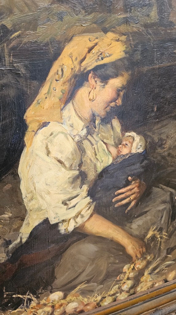Rechts Kunstmuseum Den Haag, tentoonstelling Haagse School, schilderij van Jozef Israëls “Als men oud wordt”. Links Museu José Malhoa, Caldas da Rainha, schilderij van Alves Cardoso “Uma pausa forçada”, een gedwongen pauze. Bij beide schilderijen heb ik lang stilgestaan.
