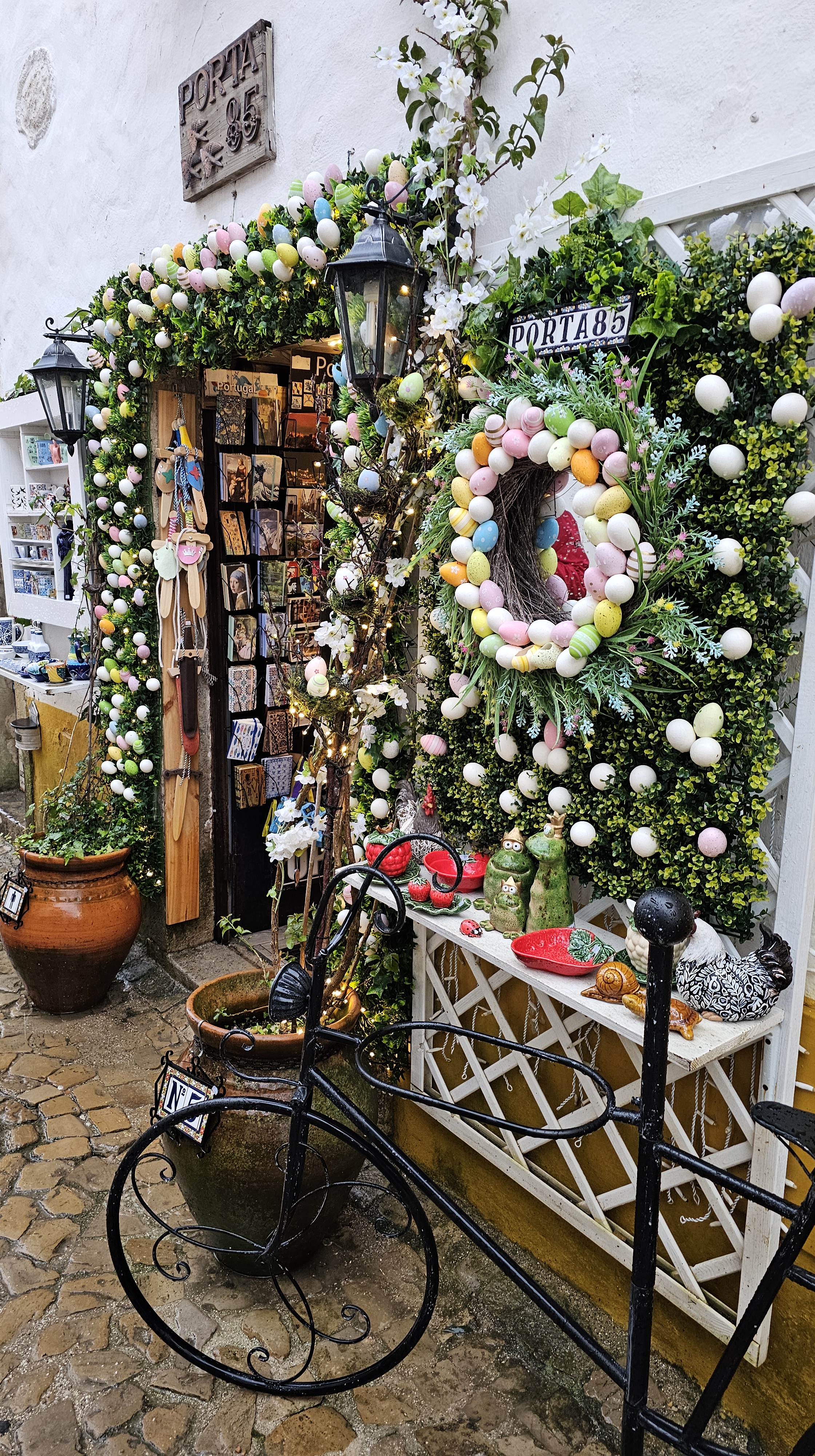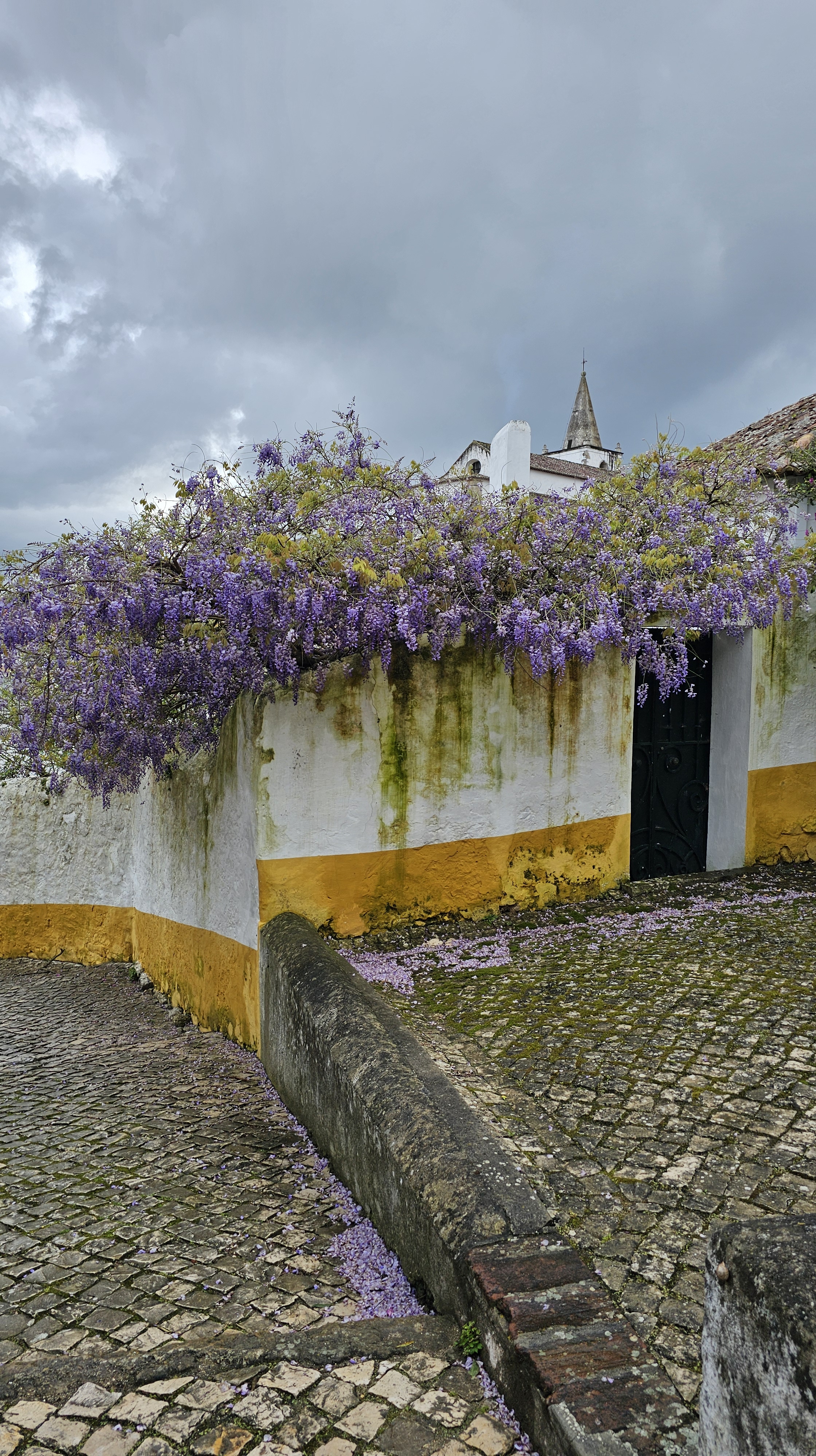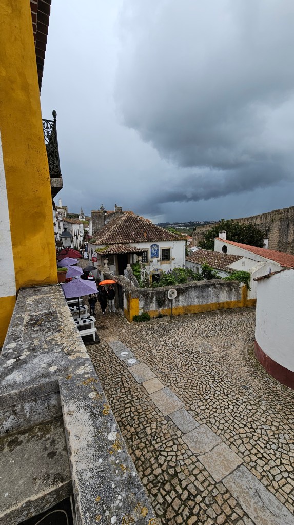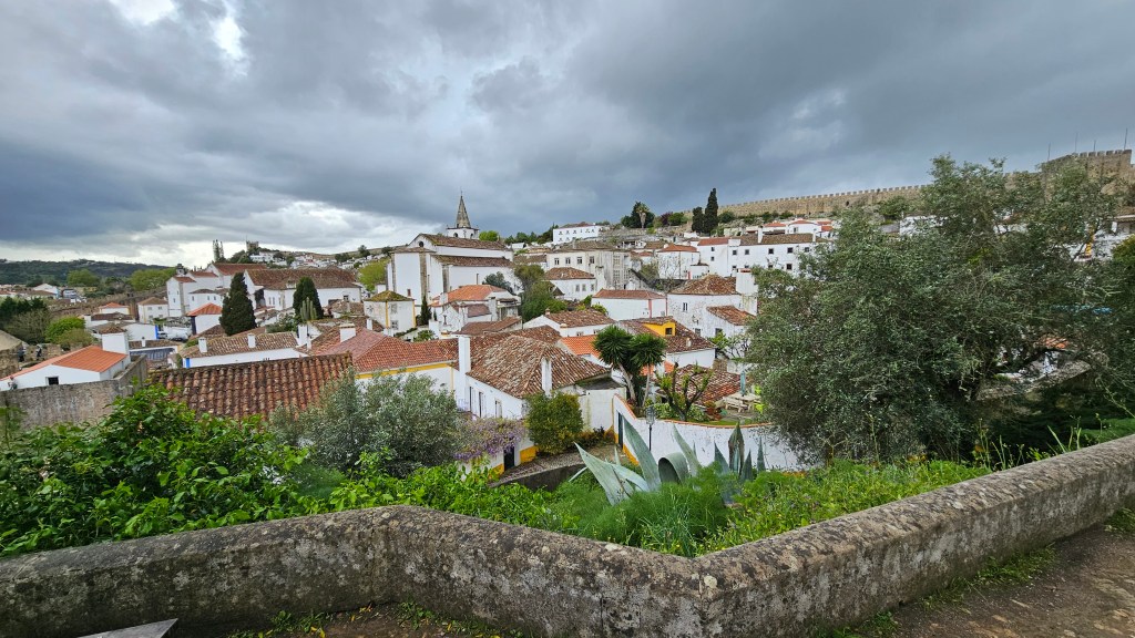 We lopen net Óbidos in als we een donkere wolk zien waaruit gerommel klinkt. Twee flinke klappen volgen (de bliksem daarvan is dus bij ons ingeslagen, maar ja, dát weten we dan nog niet…). Daarna klaart het even op en wandelen we als toeristen door de straten van dit middeleeuwse vestingstadje. Mijn man ontdekt zelfs een uitzichtpunt waar we nog nooit zijn geweest. Hoe leuk is dat?