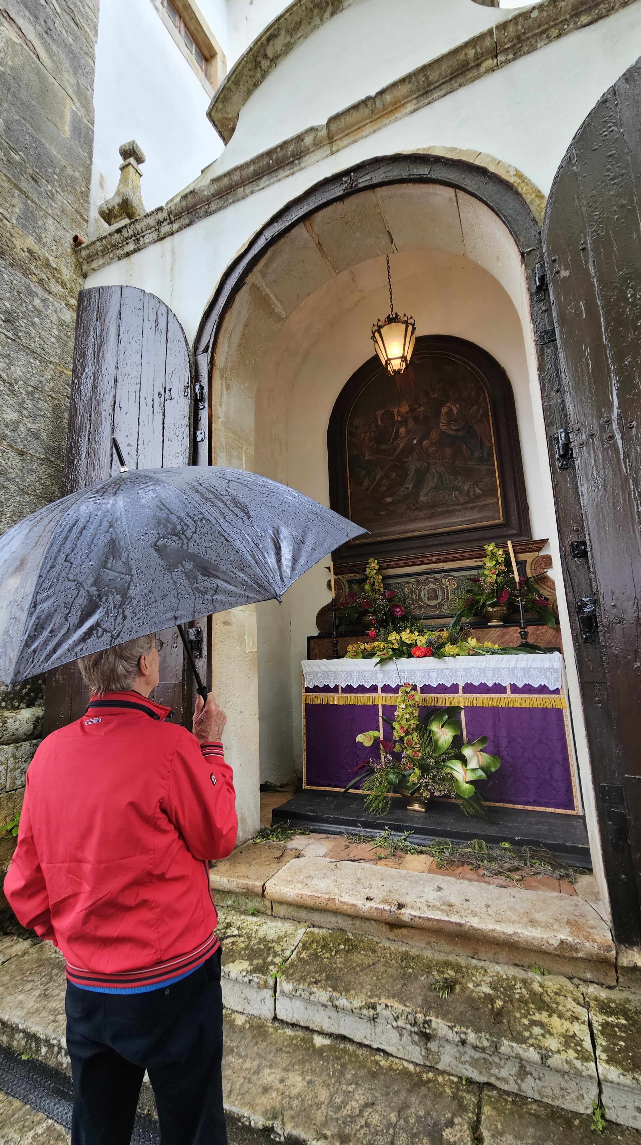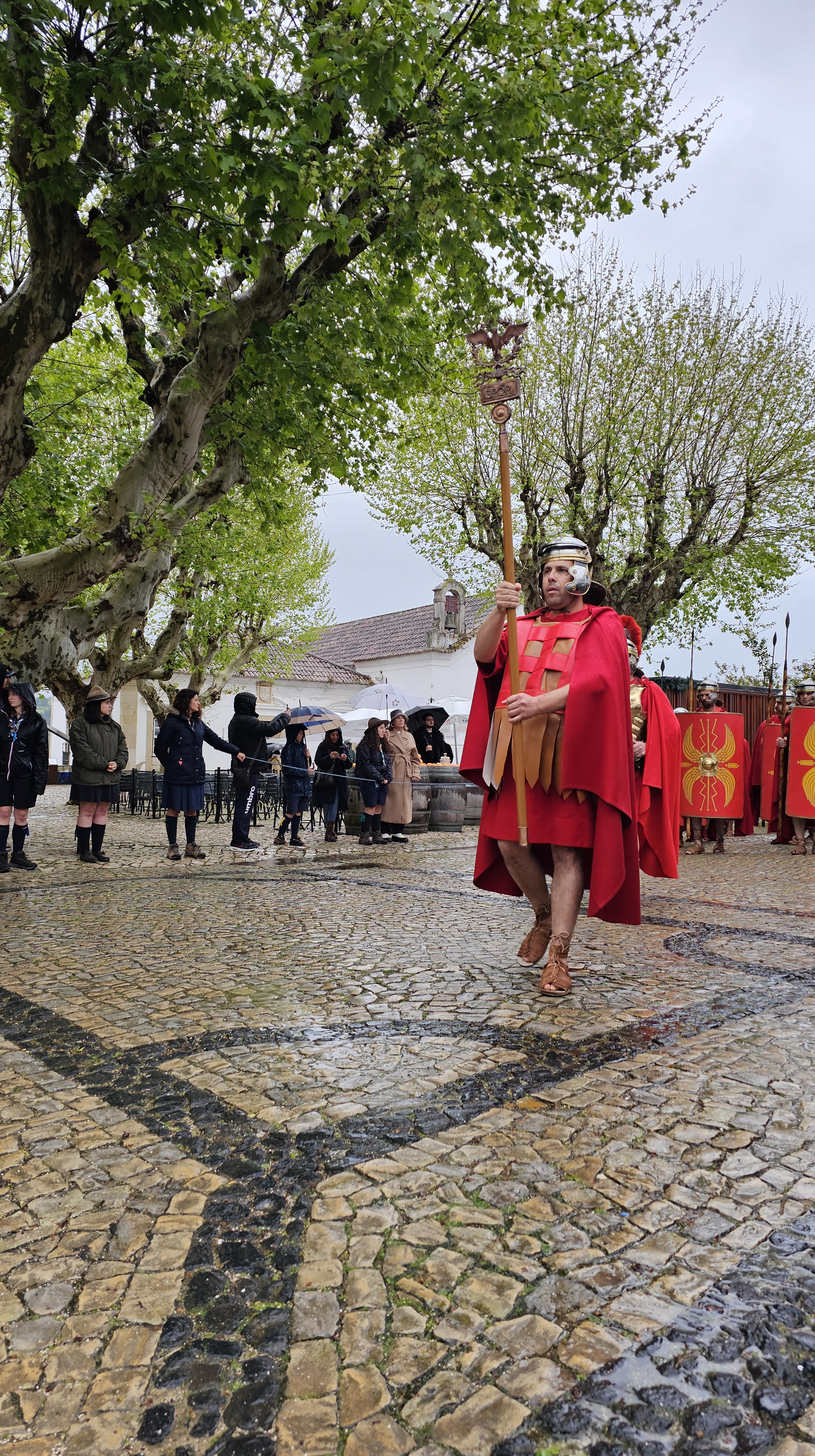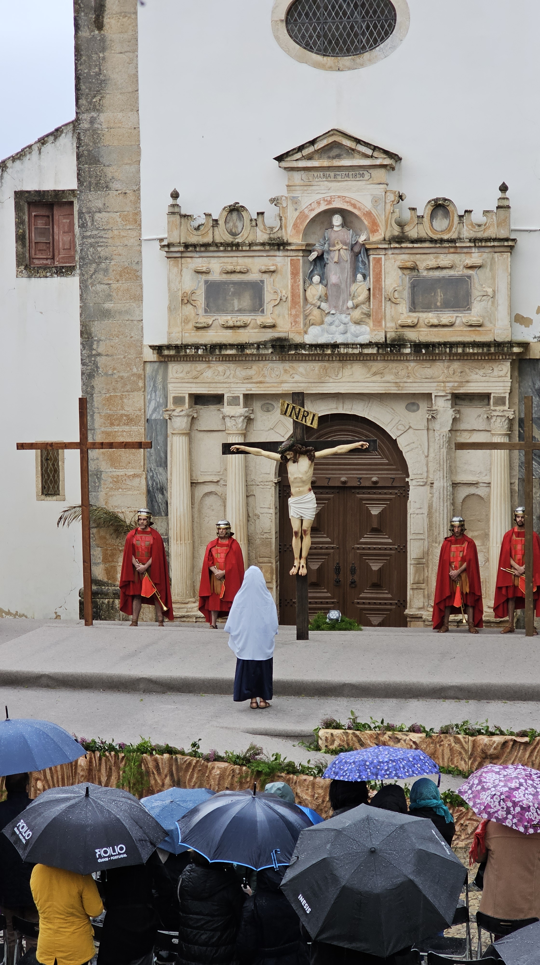 Omdat we nu toch in Óbidos zijn besluiten we om te wachten tot vijf uur, het uur waarop de ceremonie van de Auto do Descimento da Cruz gepland staat. Dus uiteindelijk staan we in de stromende regen bij het centrale plein te wachten op het moment waarop de regen stopt en de Romeinse soldaten richting de drie kruisen zullen marcheren, om eerst te dobbelen om de bezittingen van Onze Lieve Heer om Hem daarna van het kruis te halen. Ik vind doorweekt op een processie wachten wel een mooie boetedoening voor mijn zonde om op Goede Vrijdag vlees te bestellen.