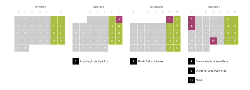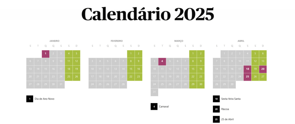 Driekoningen (6 januari ) mag dan geen vrije dag meer zijn, verder zijn er nog vrije dagen genoeg in Portugal: veertien om precies te zijn. Al is één daarvan, de dinsdag van Carnaval (Mardi Gras), optioneel. Als een nationale feestdag op een dinsdag of een donderdag valt, is er vaak ‘tolerância de ponto’. Oftewel, dan zijn er weinig of geen ambtenaren aan het werk, wat er praktisch op neerkomt dat het land even een lang weekend stil ligt. Misschien handig om rekening mee te houden als je hier van plan bent om zaken te doen of als je denkt ‘ik boek even last minute een hotelletje of een vliegreisje’. Grote kans dat je dan meer betaalt, want velen zullen deze lange weekends gebruiken om de grote stad uit te gaan naar een leuk onderkomen op het platteland of om een stedentrip te ondernemen naar bijvoorbeeld Amsterdam. In 2025 vallen de vrije dagen niet echt gunstig, zoals je hieronder kunt zien, dus men zal extra verlof op moeten nemen.