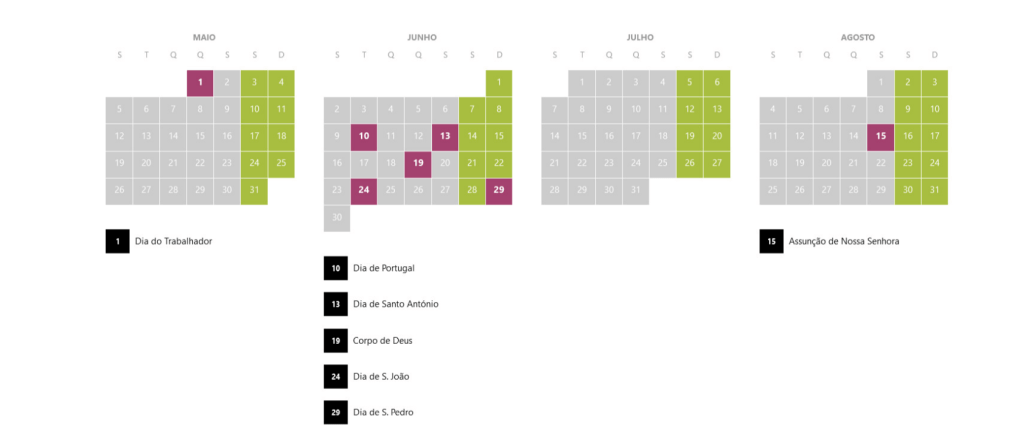 De krant Público maakt elk jaar een handig overzicht van de nationale feestdagen met daarin in de maand juni ook gemakshalve de feestdagen van alle gemeentes die dan de Heilige Antonius, Johannes of Petrus vereren (en dat zijn er heel wat, naast Lissabon, Porto én Évora). Hierboven bij de link kun je precies vinden welke steden dit zijn.