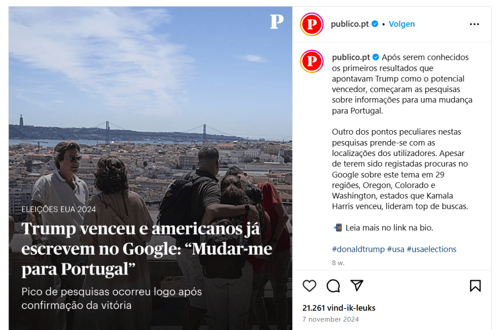 Deze maand zal Trump officieel de president van de Verenigde Staten worden. Nu kun je je afvragen: ‘Wat heeft dat met Portugal te maken?’ Nou, dit: na de overwinning van Donald Trump in november werd er een opvallende piek in Google-zoekopdrachten geconstateerd, vooral met zoektermen die te maken hadden met ‘emigreren naar Portugal’, met name in de staten Oregon, Colorado en Washington. Er werd toen intensief gezocht naar informatie over visumopties, zoals het D7-visum voor gepensioneerden en het gouden visumprogramma.