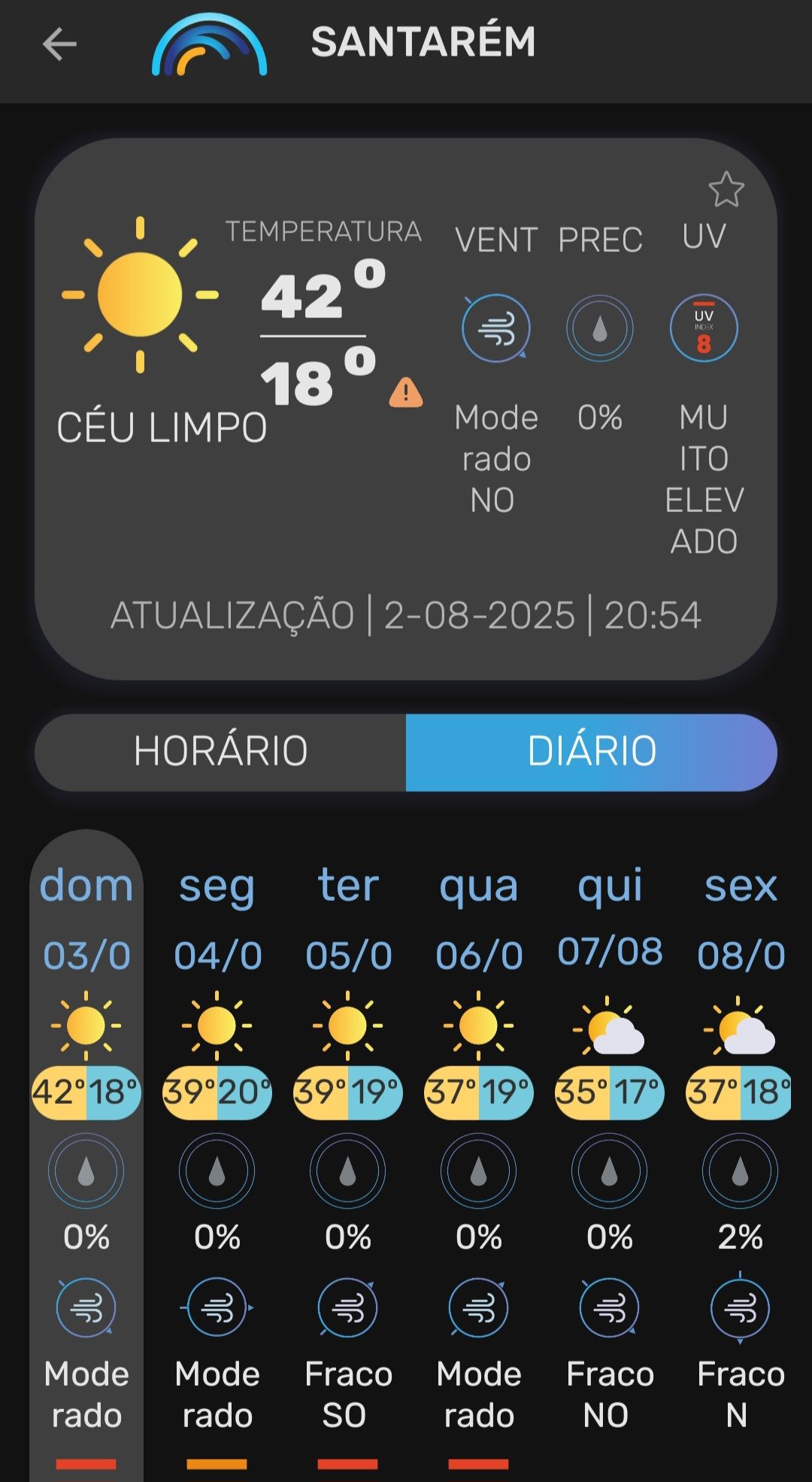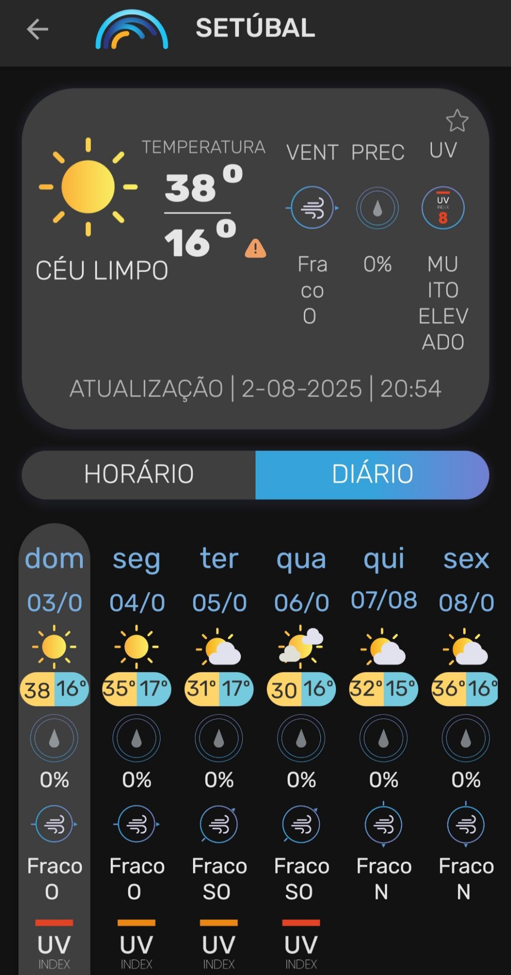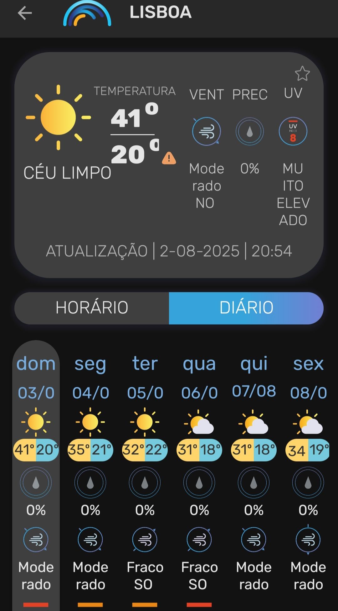 Vanaf zondag 3 augustus 2025 tot en met donderdag 7 augustus 2025 was heel Portugal, met uitzondering van het zuidelijke district Faro, onder een officieel hitte- en bosbrandwaarschuwing geplaatst. De temperaturen stegen in veel regio’s tot 36–40 °C, met uitschieters tot 44 °C in Alentejo, de Taag- en Douro-vallei . Ook ’s nachts koelde het nauwelijks af (er werd sprake van tropische nachten als de minimumtemperaturen tussen 20 °C en 25 °C blijven steken.